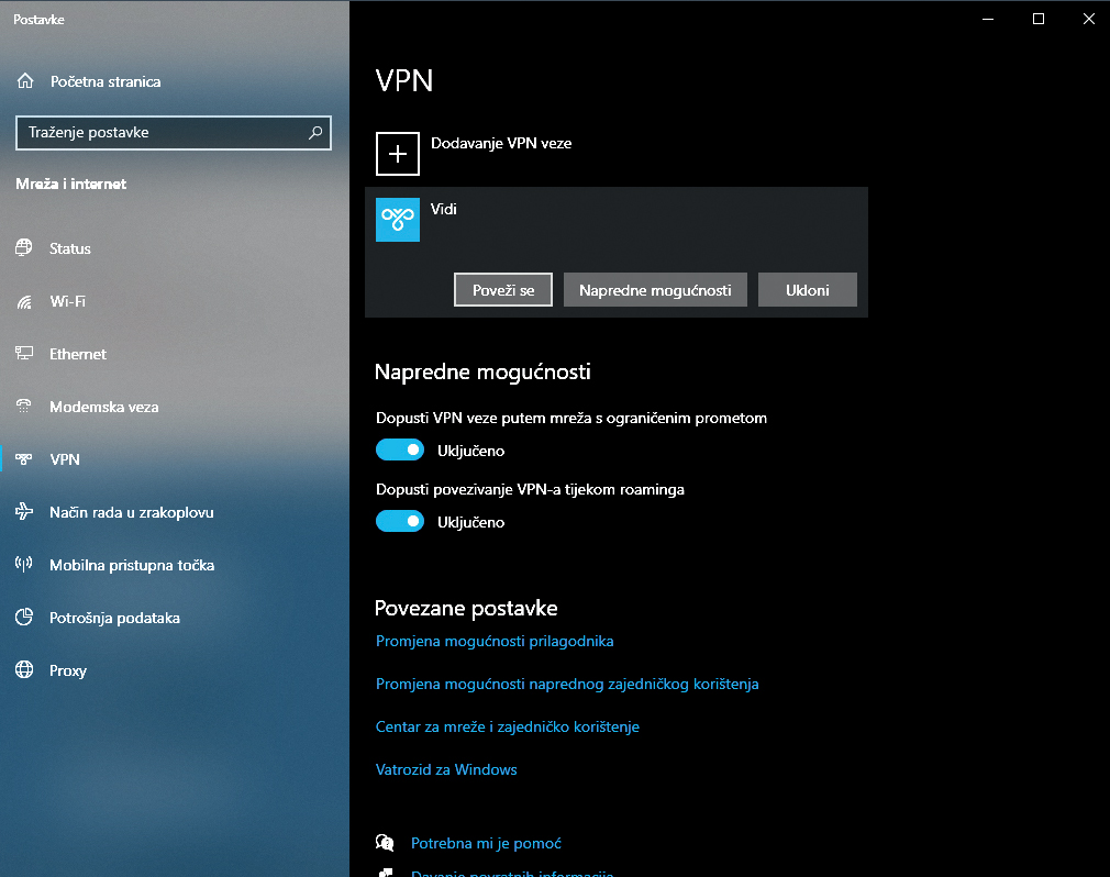 Prvo treba kreirati VPN konekciju tako da otvorite postavke mreže i interneta