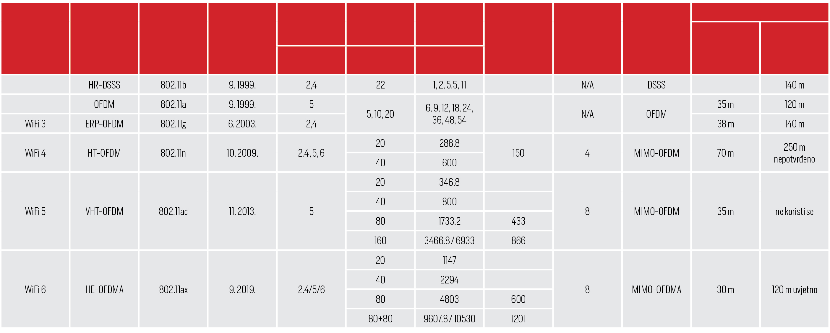 Wi-Fi mreže iz godine u godinu dobivaju novije standarde te sve veću propusnost. Tako su danas najrašireniji uređaji koji podržavaju Wi-Fi standarde oznaka 802.11 a/b/g/n/ac/ax.