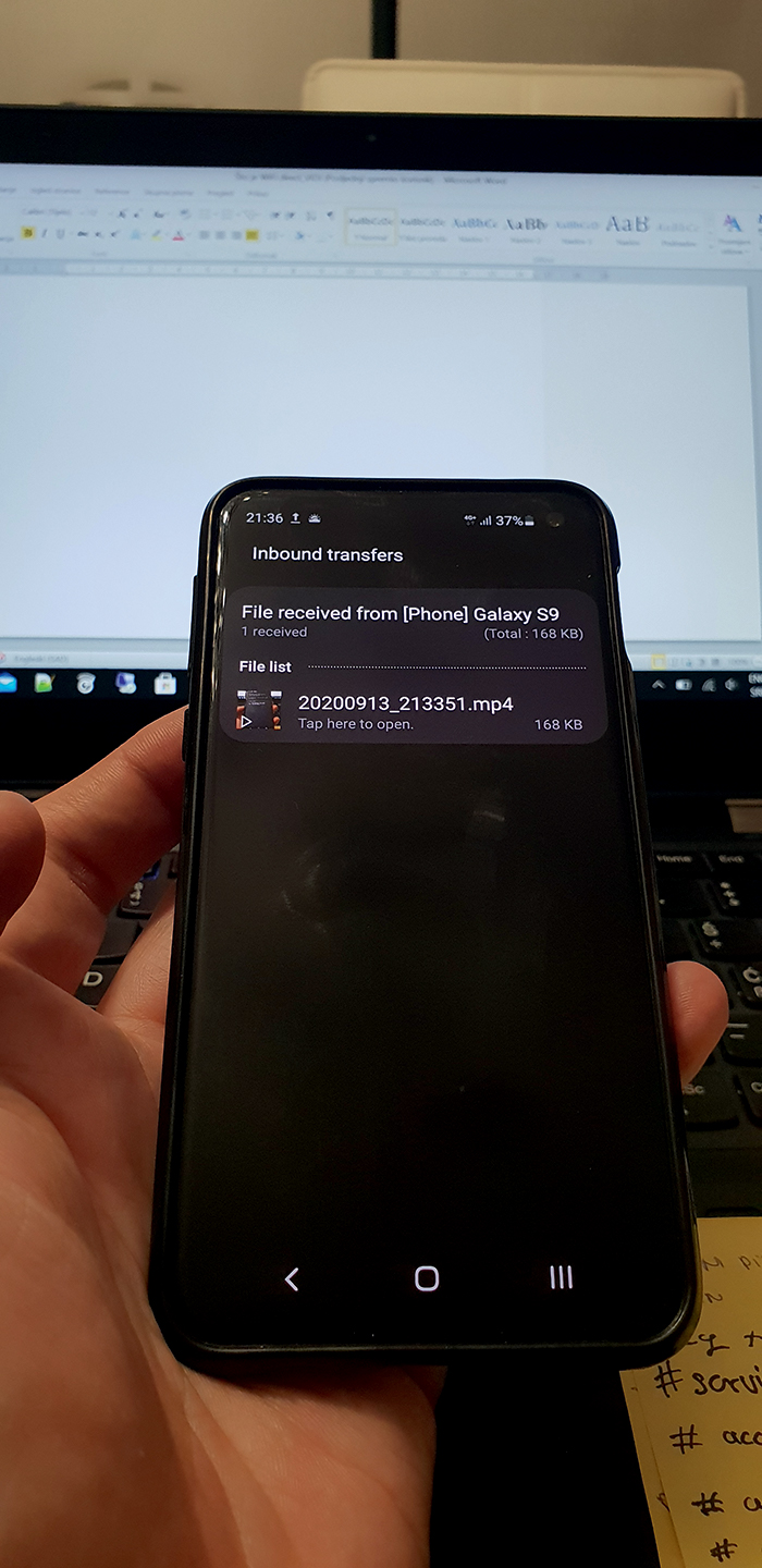 2. Slanje/primanje datoteka je trivijalno jednostavno. Potrebno je odabrati dijeljenje (Share), zatim odabrati željenu datoteku (ili skup datoteka) koju trebate prenijeti na drugi uređaj. Primitak poslane datoteke bit će prikazan na uređaju.