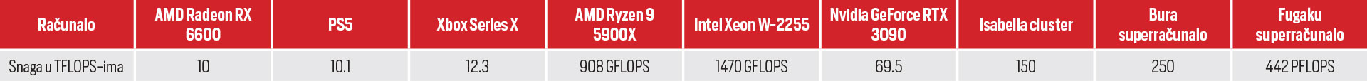 Jedna od mjera za izračunavanje snage računala su FLOPS-i. Radi se o akronimu za računske operacije koje uključuju iracionalne brojeve i decimalne zareze. To su mnogo složeniji izračuni u odnosu na realne brojeve pa se zbog teškoća kod izračunavanja ova mjera koristi za izračunavanje snage sustava. Jedan TFLOPS se odnosi na izračun trilijuna floating-point operacija u sekundi. Kod prošlogodišnjeg lansiranja gaming konzola nove generacije njihova se snaga također uspoređivala u TFLOPS-ima. PS5 ima 10,3, a Xbox Series X 12,1 teraflopsa. To znači da nova plejka može izvršiti 10 trilijuna floating point operacija u sekundi. Kod gaminga, to je značajno zbog izračunavanja velikog broja poligona.