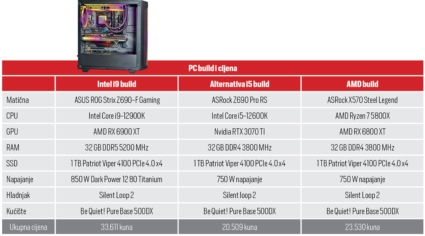 Alternativno, voljeli bismo da i5 build donosi značajne uštede, no cijena grafičkih kartica ostaje nevjerojatna prepreka za bilo kakvu kupnju novog računala. Ipak, i5 12600K s dobrom DDR4 memorijom pružiti će vrhunske gaming performanse te stavlja velik pritisak na dosta skuplje AMD procesore i trenutno je topla preporuka s naše strane. Ima dovoljno performansi da istovremeno možete i streamati vaše gaming avanture u FullHD-u bez droppanih frameova, što je svakako plus.