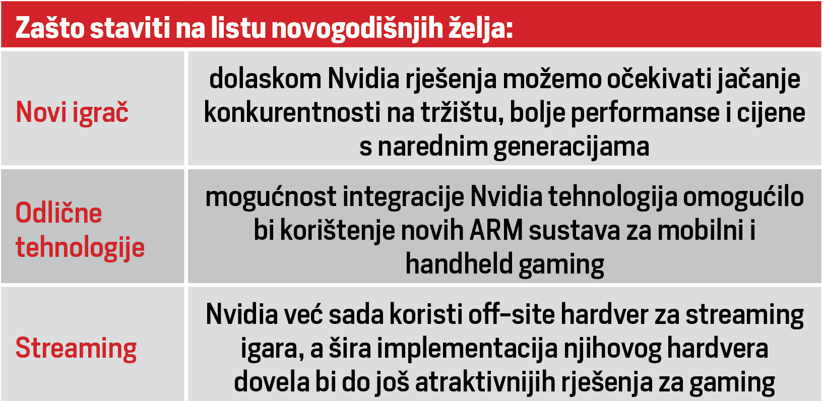 Priča se i da je riječ o ARM rješenju, što bi dalo vjetar u leđa Windowsima na ARM platformi koja za sada ima samo Qualcommove procesore kao jedinu opciju. Nvidiji ovo neće biti potpuno nepoznat teren jer već proizvodi procesore za servere, no krajnji kupci često su dosta zahtjevniji sa potrebom da se podrži ogroman broj aplikacija i programa. S druge strane, mogli bismo vidjeti i apsolutnu eksploziju u mobilnom gamingu na handheld konzolama i laptopima ako potrošnja energije bude adekvatno kontrolirana.