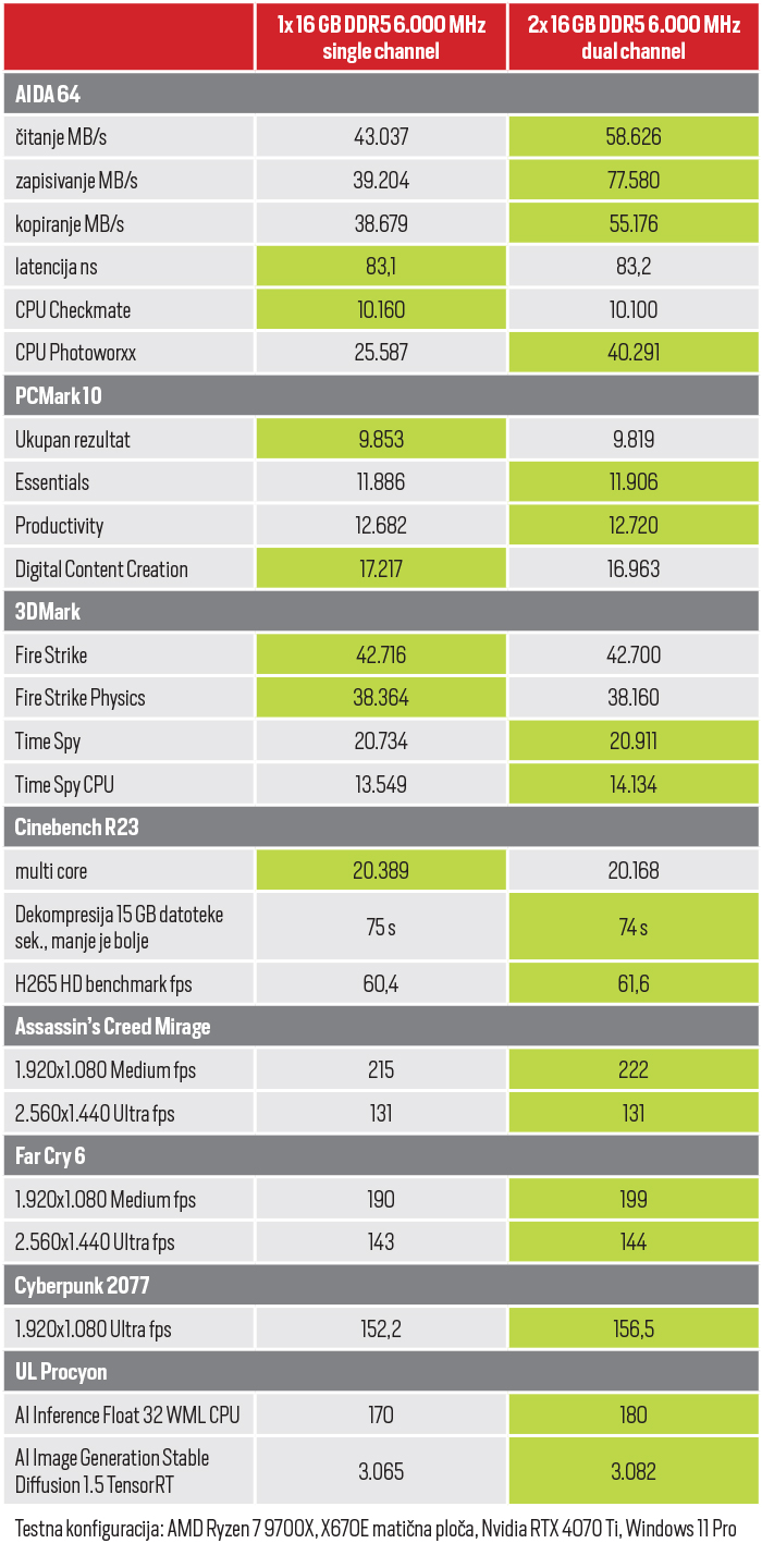 Kada je u pitanju DDR4 memorija, pad performansi prilikom korištenja jednog modula je (posebno u nekim aplikacijama) bio prilično značajan. Kakva je situacija s DDR5 memorijom? Rezultati testiranja su u najmanju ruku vrlo zanimljivi. Za potrebe ovog testa smo prvo ugradili jedan 16 GB modul brzine 6.000 MHz i izmjerili performanse, a potom dodali još jedan isti takav modul koji inače dolazi u memorijskom kitu.