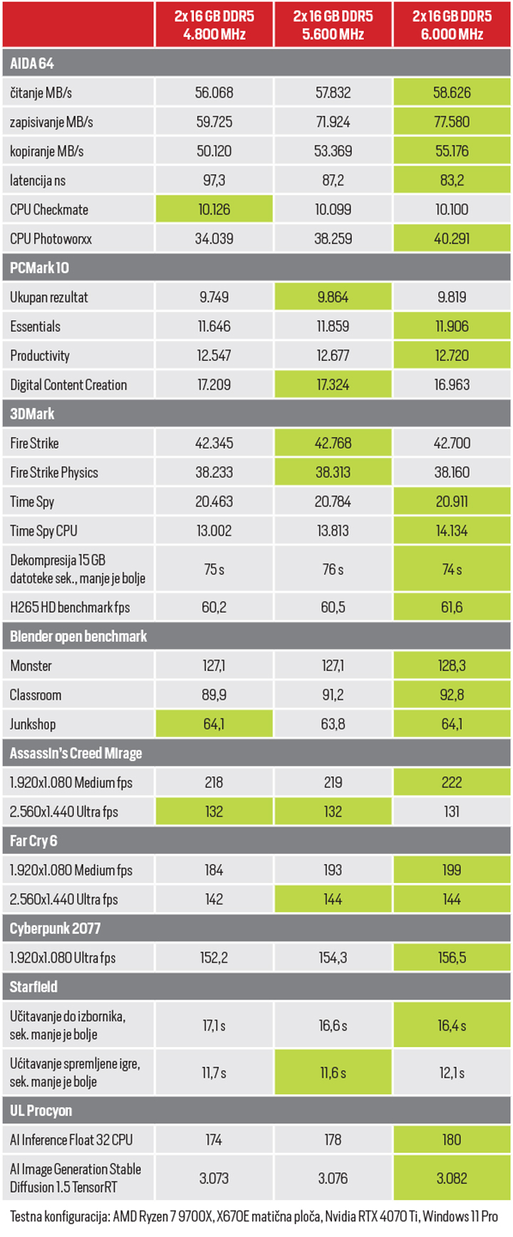 Možemo reći kako smo u dobrom dijelu testova zabilježili bolje performanse s bržom memorijom. Pritom je razlika između memorije koja radi na 4.800 u odnosu na 5.600 MHz veća nego što je to slučaj kada je u pitanju porast s 5.600 na 6.000 MHz. Premda i tu razlike postoje.