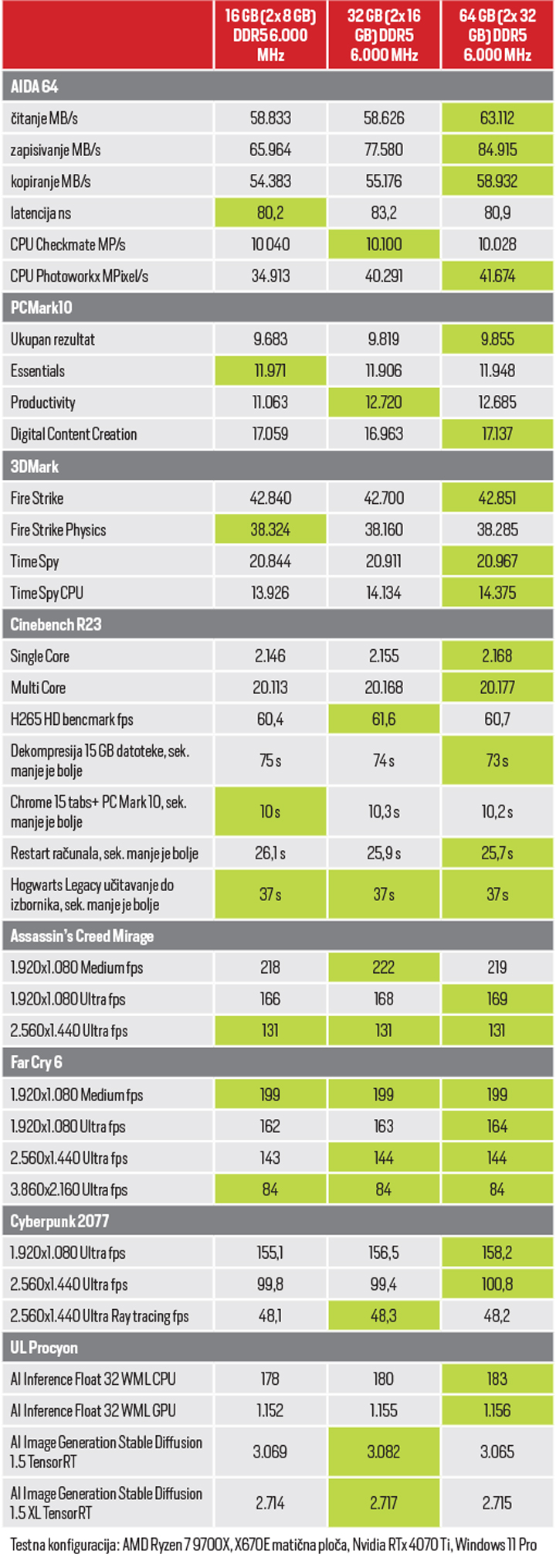 Na kraju, možemo zaključiti kako je danas, kada su u pitanju mainstream računala, 16 GB radne memorije ono što je 8 GB bilo prije koju godinu. Nekakva minimalna količina radne memorije dovoljna za ugodan rad. Danas je posve jasno da, ako želite optimalne performanse u igrama i svim drugim najčešće korištenim aplikacijama, 32 GB predstavlja optimalan odabir. Već dosta igara zahtijeva 32 GB za optimalne performanse, a Microsoft za svoj najnoviji Flight Simulator preporuča i 64 GB.