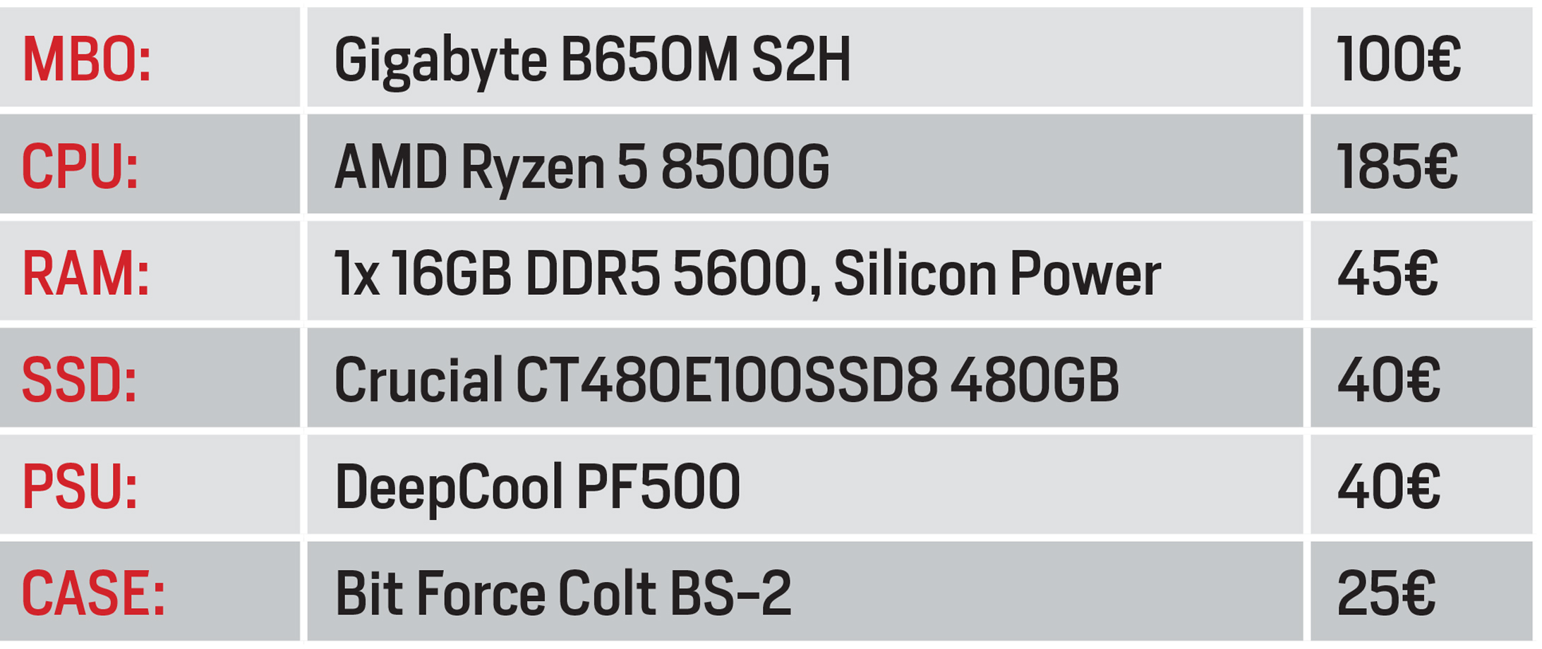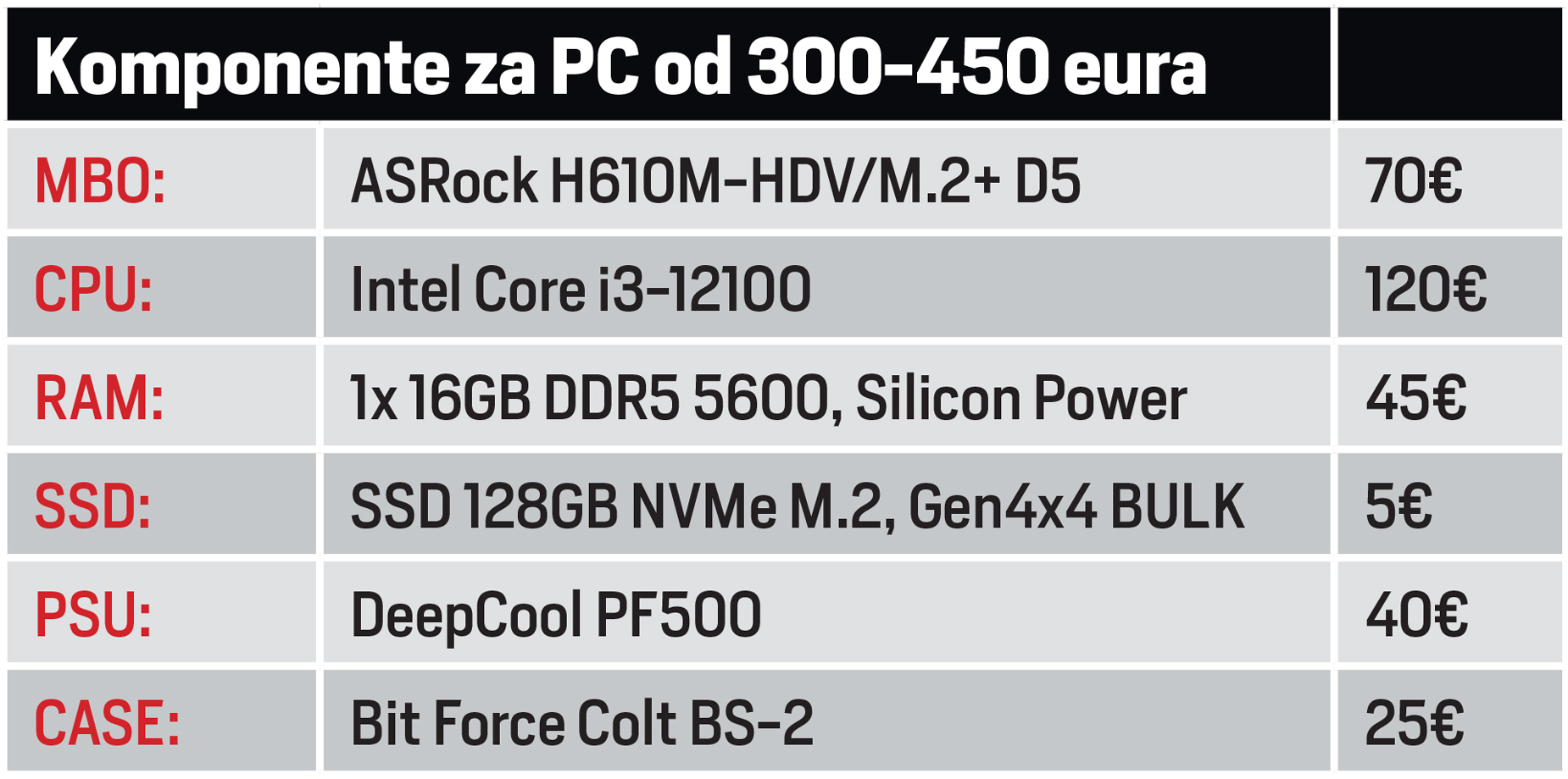 Uvijek popularna disciplina, najrudimentarnije računalo za osnovne potrebe i što manje novaca. Surfanje, office, multimedija, čak i uredska mašina bez previše potreba za pohranom. Ovakva kombinacija za okvirnih 300€ nije ni približno dno dna po pitanju mogućnosti i na kraju dana je sasvim sposobna konfiguracija. Ljudi često pitaju za savjet i strahuju da će im ovako nešto biti preslabo, ali čak i osnovne konfiguracije su danas poprilično moćne. Procesor s osam threadova, više nego dovoljan za osnovne zadaće i otvorena opcija za nadogradnje ako se kasnije pokaže potreba. Matična podržava i jače i novije modele Intel procesora (13. i 14. generacija uz potencijalni BIOS update), DDR5 RAM je aktualan i u matičnoj ima mjesta za još jedan modul. Mjesta za dodatne 2.5” ili 3.5” diskove u kućištu ima za veću mogućnost pohrane, a natapanje može akomodirati i nekakvu mid-range grafičku karticu ako jednog dana u tom smjeru krenu nadogradnje za laganije igranje u FHD formatu.