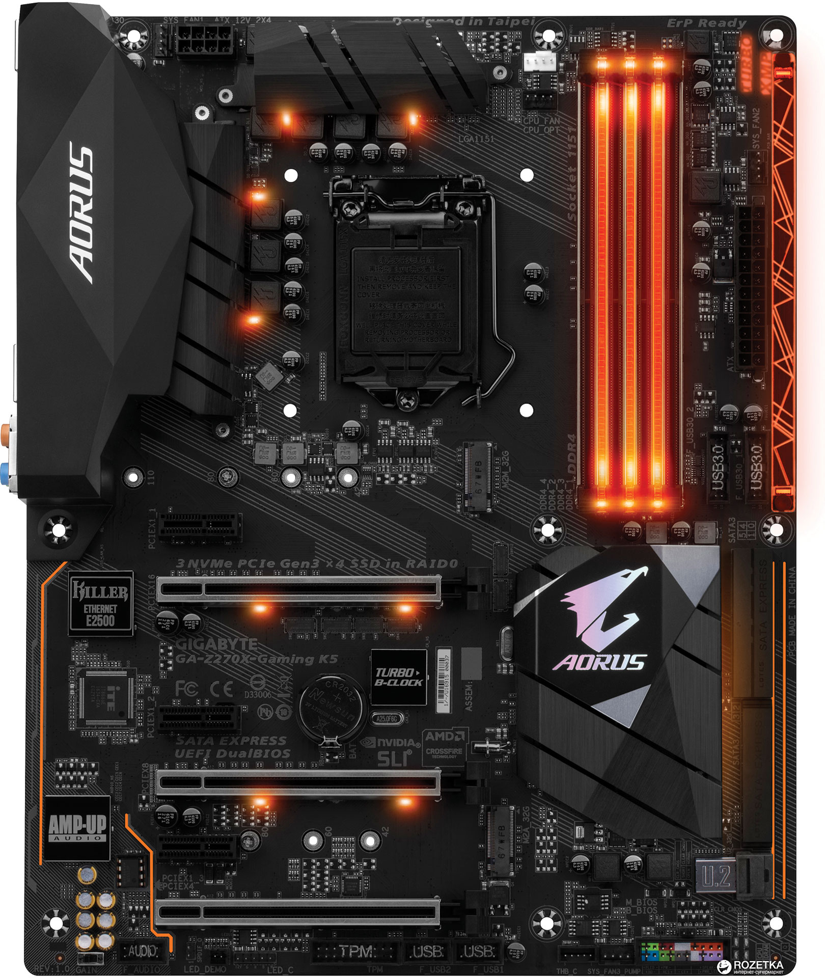 Ova matična ploča ima najjači novi čipset-Z270. Stoga je zanimljiva zbog svojih mogućnosti overclockinga, podržava SLI i Crossfire za grafičke kartice. Možete imati tri NVMe PCIe SSD-a u RAID 0, za one koji to vole, a podržava i RGB LED osvjetljenje za stvaranje svjetleće atmosfere. Uz ovu ploču registracijom na Gigabyteovom siteu, dobit ćete 20 USD na Steam accountu.