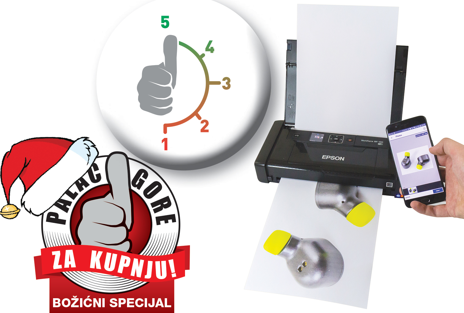 WorkForce WF-100 Vrsta pisača: prijenosni printer u boji Brzina ispisa: 65 sec za A4 stranicu Spajanje: Wi-Fi, USB Dimenzije i masa: 30,99 x 23,11 x 21,59 cm - 1,6 kg Cijena: 1.487,16 kn Viđeno u: pcshop.hr