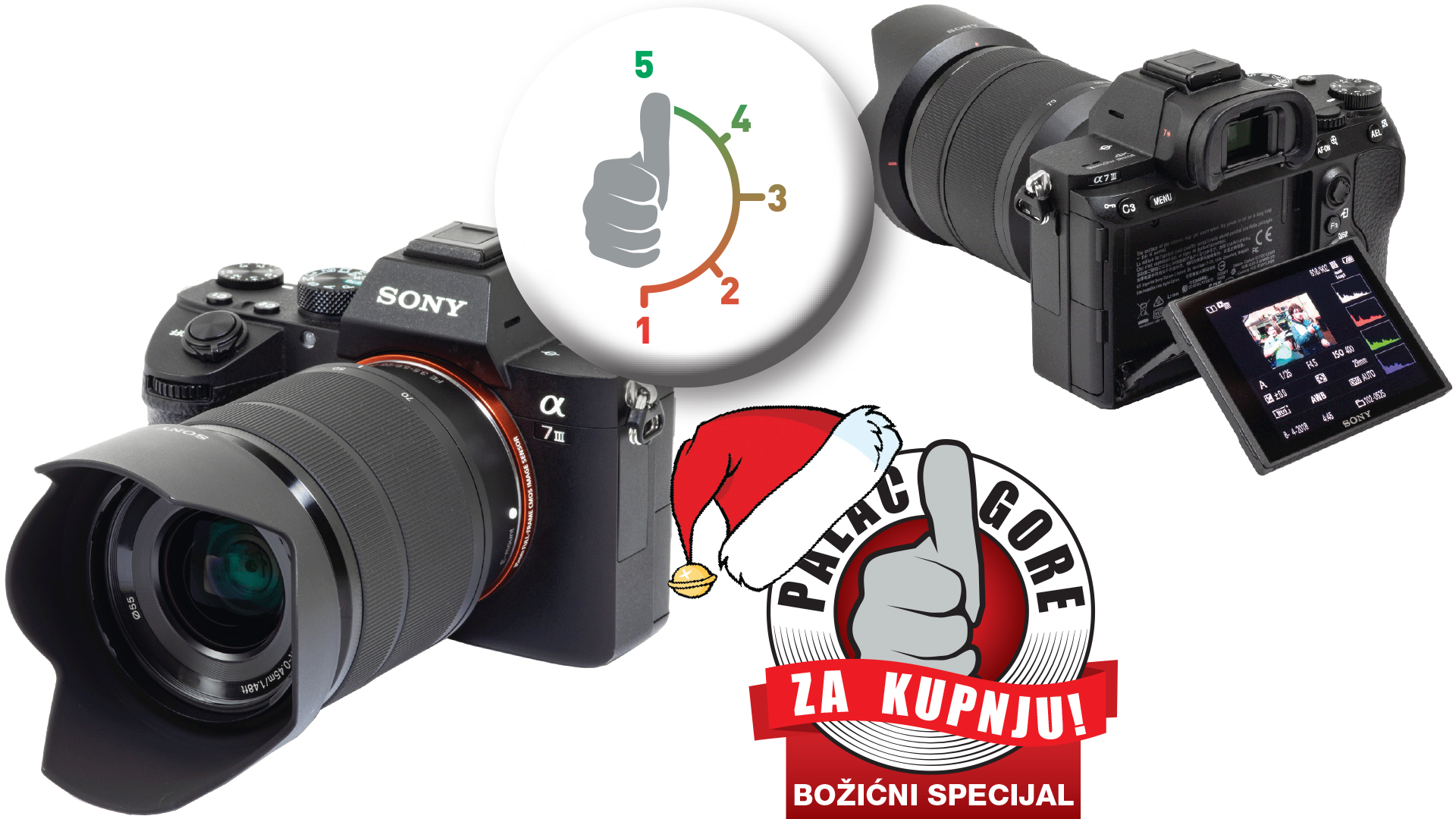 Odlikuje ga odlična stabilizacija i kvaliteta slike te mnoštvo opcija za koje će vam možda zatrebati i upute za korištenje jer ih jednostavno ima previše. Koristi se cijeli senzor za snimanje 4K rezolucije, fotoaparat snima video materijale izvrsne kvalitete te će najviše koristi od njega imati oni koji žele iskoristiti mogućnosti 4K video snimanja. PROTIV: Malen početni izbor vrlo skupih Sony leća. Model: Sony ILCE-7M3KB Senzor: 35 mm full frame (35.6 × 23.8 mm), Exmor R CMOS senzor 25,3 megapiksela Rezolucija: 24 MP, 6000 x 4000 piksela Video: 4K @ 30 fps Cijena: cca 18.500,00 kn Viđeno u: Sony Hrvatska, www.sony.hr