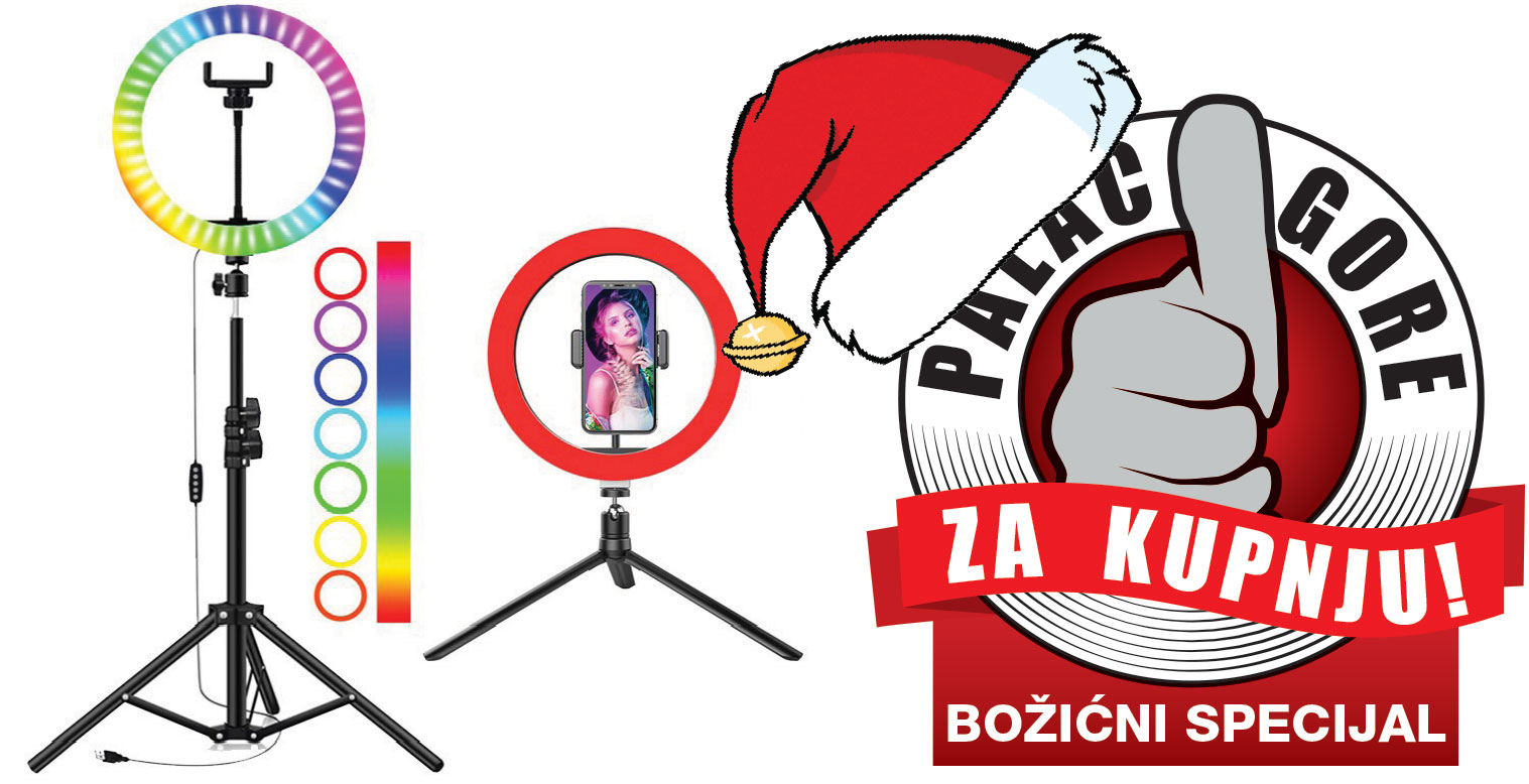 ZA: Stalak za snimanje slika i videa pomoću mobitela dobar je odabir za svakoga tko je aktivan na društvenim mrežama. Idealan je za snimanje videa za YouTube, Instagram, TikTok, kao i za snimanje fotografija visoke kvalitete s profesionalnim izgledom. Držač dodatno na sebi ima i RGB osvjetljenje u obliku prstena kako bi bolje rasprostro svjetlo i dao mekši izgled osvjetljenja na slikama. Ring s osvjetljenjem moguće je rotirati za 360° kako bi ga prilagodili kutu koji vam je potreban za snimanje. Može se sklopiti i lako prenositi. Visina tripoda može se podesiti do max. 160 cm (186 cm s lampom). Tri su razine osvjetljenja (toplo, hladno, žuto/warm light, cold light, soft light), a 3000k (hladno/plavo) - 6000k (toplo/žuto) je raspon boja. LED lampa ima promjer 26 cm (10˝), pa je samim time i lako prenosiva. Napaja se putem USB utora od 5 V, odnosno, osim toga što je kompatibilno s računalima i laptopima, može se upaliti preko bilo kojeg punjača mobitela s USB-A utorom, kao i preko power banka. To znači da ga možete iskoristiti i van kuće za bolje osvjetljenje. Za preciznije rezultate, možete prilagoditi svjetlinu od 10% do 100% snage. Osim topline, svjetlo možete postaviti i u nekoliko različitih boja i dinamičnih efekata putem kontrolera ugrađenog u žicu od napajanja. Stalak koristi standardni navoj tako da ga dodatno možete koristiti i za montiranje drugih uređaja manjih težina.