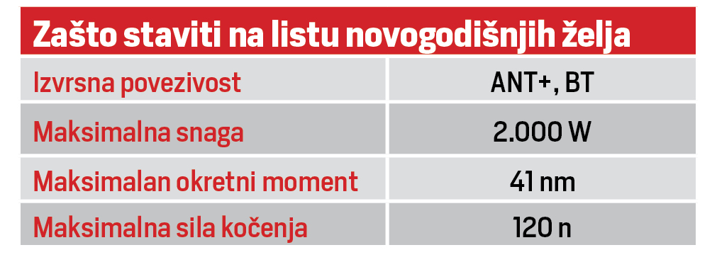Uz sve to, dizajniran je da bude dovoljno tih kako bi se na njemu moglo vježbati i u stanu. Trenažer se isporučuje s dodatnim adapterima za osovine koji znatno povećavaju osovinsku kompatibilnost. Kompatibilan je s osovinama dimenzija 142 x 12 mm i 148 x 12 mm izravno iz kutije. Maksimalna snaga vozača koju podržava iznosi 2.000 W. Mjeri vašu brzinu, kadencu i snagu.