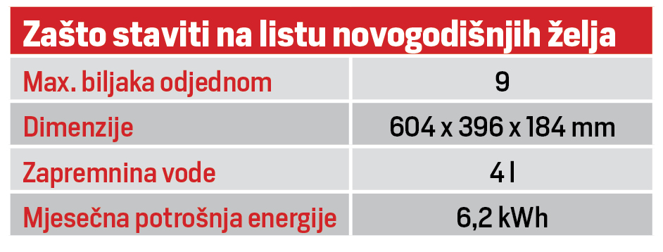 Ovaj sustav podržava do 9 sadnica koje će samostalno biti zalijevane te osvjetljene za idealan rast bez da išta sami trebate napraviti. Osim samog uređaja, kao i kod aparata za kavu, trebate kupiti već spremne kapsule sa zemljom i sjemenkama, te sve započinje jednim klikom u aplikaciji na koju je ovaj sustav povezan. Prednost ovakvog pristupa je iznimno jednostavno uzgajanje, a oni koji vole svježe začine vrlo će se lagano pronaći u ovakvom proizvodu.