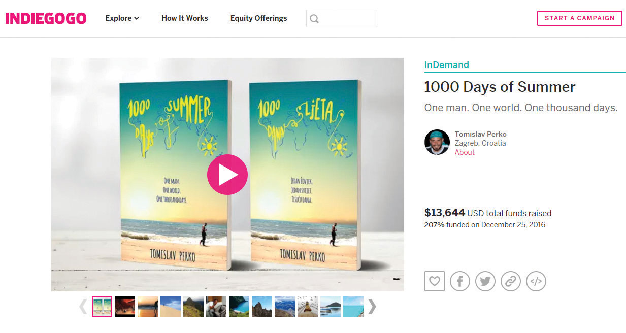 Uvjeti pristupanja na Indiegogo nisu komplicirani, tvrdi Perko: “Samo trebate napraviti svoj račun, napisati priču oko vašeg projekta, eventualno snimiti video, staviti nešto fotografija, odabrati cijenu i količinu/vrstu nagrada (perkova), i vaša crowdfunding avantura može započeti.” Ovaj mladi putopisac na Indiegogo kampanji je bio dva puta. Prvi put je tražio novce za knjigu 1000 Days of Spring, a drugi put, krajem prošle godine, sredstva za izdavanje druge knjige, 1000 Days of Summer. Obje kampanje financirane su s nešto više od 13 tisuća dolara.