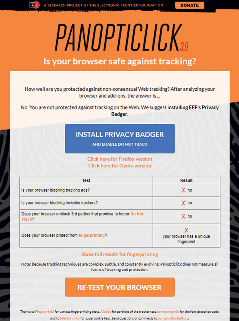Općenito, internetske kompanije razvile su set iznimno učinkovitih, ali invazivnih metoda i alata putem kojih prate vaše ponašanje na internetu. Panopticlick, dijagnostički alat neprofitne organizacije za digitalnu privatnost Electronic Frontier Foundation (EFF), kratkom provjerom brzo može pokazati koliko se vaši web pretraživači dobro brane od različitih trackera i metoda praćenja, uključujući i „browser fingerprinting”, metodu praćenja web pretraživača po podacima iz postavki i konfiguracije uređaja (OS, rezolucija ekrana, jezik i vrijeme), a ne IP adresa ili kolačića.