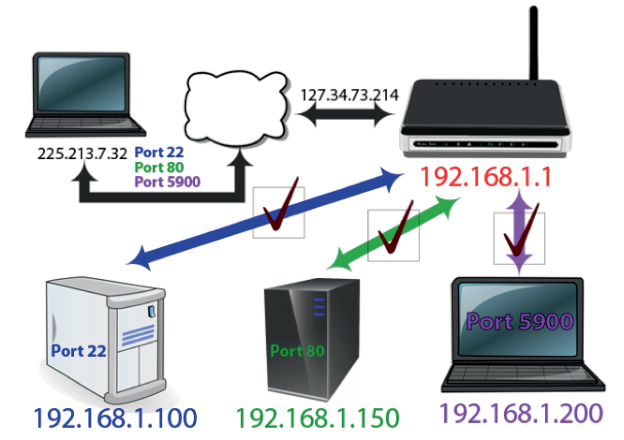 Primjer 1. Ukoliko sa vašim laptopom pristupate kućnoj mreži (preko routera, naravno) koristeći port 22, vaš router zna da u tom slučaju će vas „preusmjeriti“ na unutrašnju IP adresu 192.168.1.100. Port 22 je defaultni port za SSH uslugu (Secure Socket Shell). Ukoliko pristupite mreži na isti način preko porta 80, router će vas preusmjeriti na unutrašnju IP adresu 192.168.1.150. To isto vrijedi za port 5900 koji će vas „preusmjeriti“ na IP adresu 192.168.1.200.