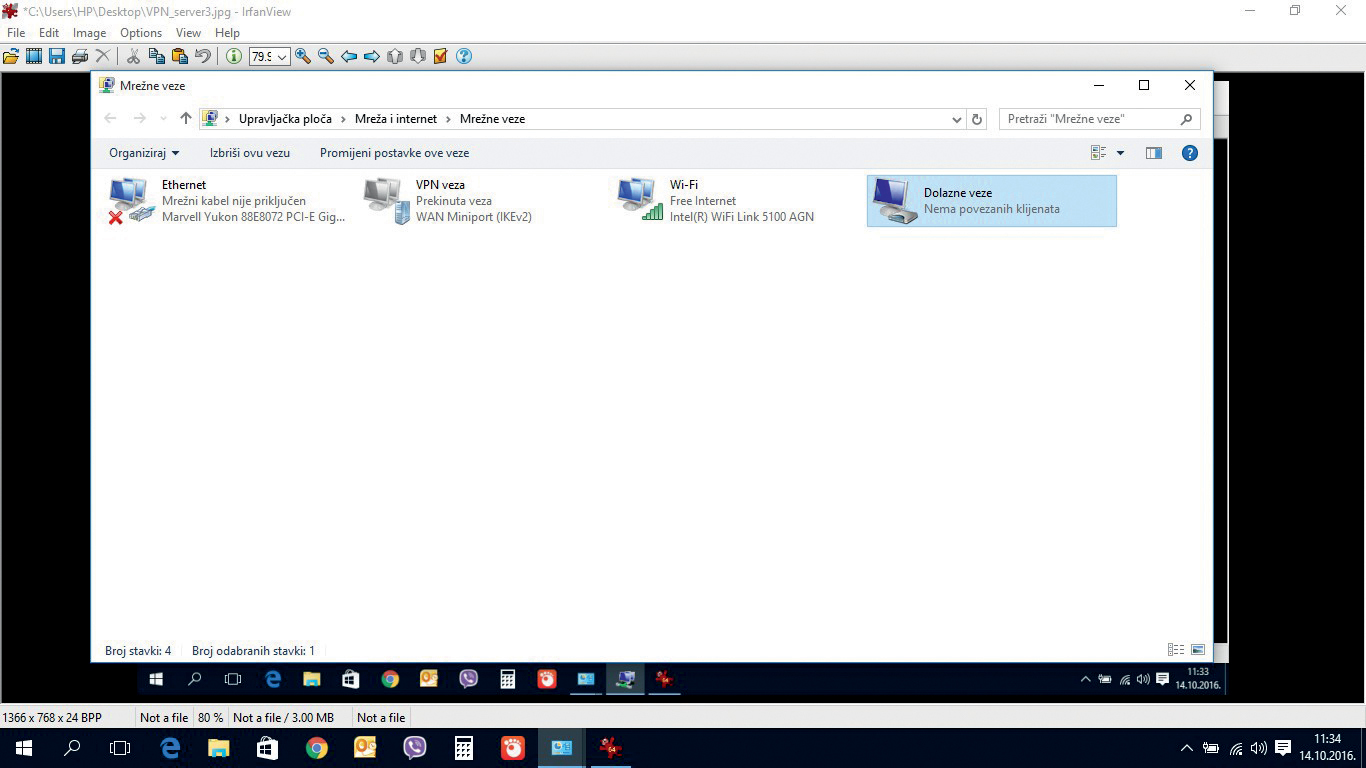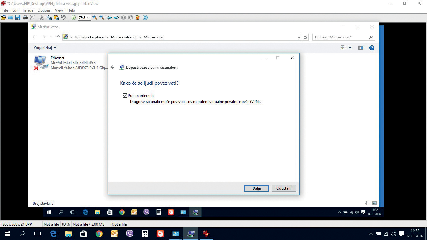 1. Kako kreirati VPN server bez ikakvog dodatnog softvera? Da biste stvorili VP server potrebno je otvoriti > “Mrežne veze” (možete i putem command prompta Start > Run > ncpa.cpl). Nakon toga u izborniku Datoteka (File) odaberite “Nova dolazna veza” (New incoming connection) te označite kvačicu “Putem interneta”
