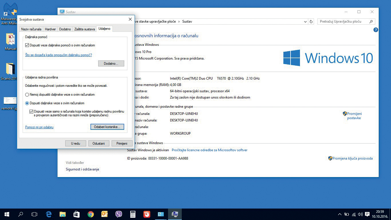 3. U prozoru svojstva sustava (System Properties) odabrati karticu Remote (daljinski pristup) > kliknuti na Allow remote connections to this computer (dopusti daljinske konekcije na ovo računalo)