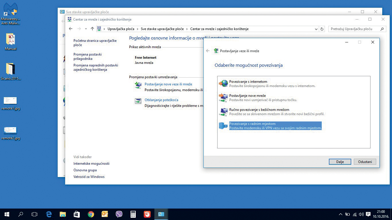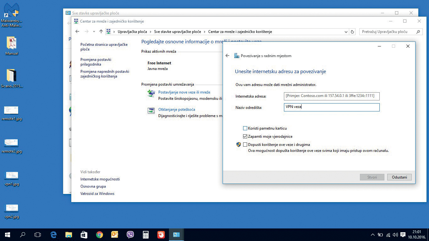 Kreiranje VPN konekcije. Upravljačka ploča > Centar za mreže i zajedničko korištenje > Stvori novu vezu. Odabrati povezivanje s radnim mjestom (VPN)