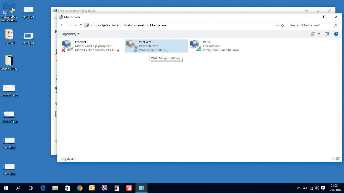 Pregled mrežnih veza u postavkama mreže. Primijetite kreiranu VPN konekciju. Pozivate je klikom na ikonu (poput WiFi-ja)