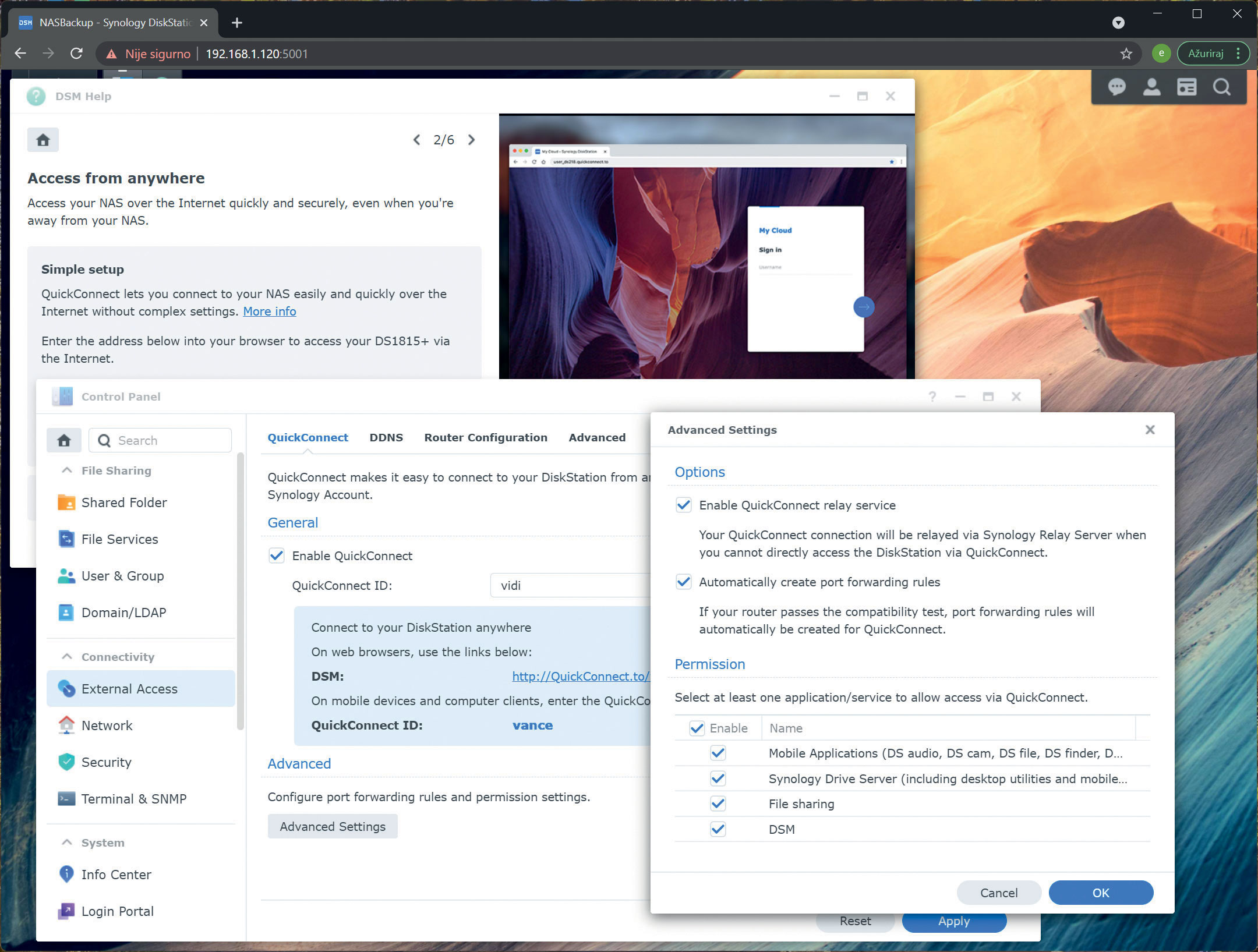 Sad će vaš DSM Help izbornik provesti kroz šest koraka postavljanja vašeg NAS uređaja. U prvom koraku postavljate Active Insight nadzor stanja vašeg NAS-a. U narednom koraku možete postaviti pristup NAS-u putem interneta kako bi vaš NAS postao vaš osobni Cloud dostupan od bilo kuda gdje postoji Internet veza. Klikom na Advanced Settings možete odrediti kojim uslugama želite, a kojima ne želite dozvoliti pristup putem Synologyjevog QuickConnect ID-a.