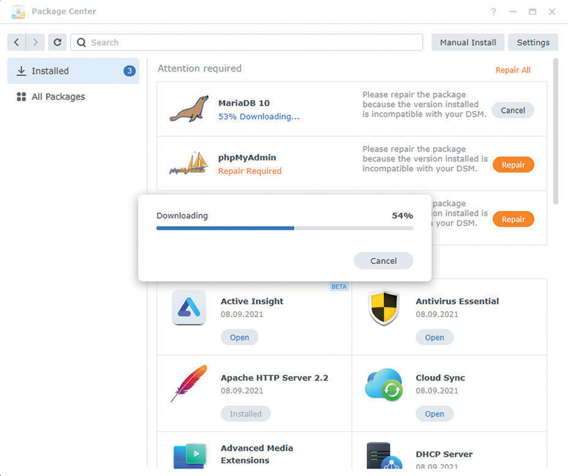 Za kraj je potrebno zaviriti u Package Centar kako bi ručno pokrenuli popravak paketa koji se nisu uspjeli instalirati automatski. U našem slučaju zatekli su nas paketi MariaDB, phpMyAdmin te WordPress. Njihov popravak prošao je bez problema.