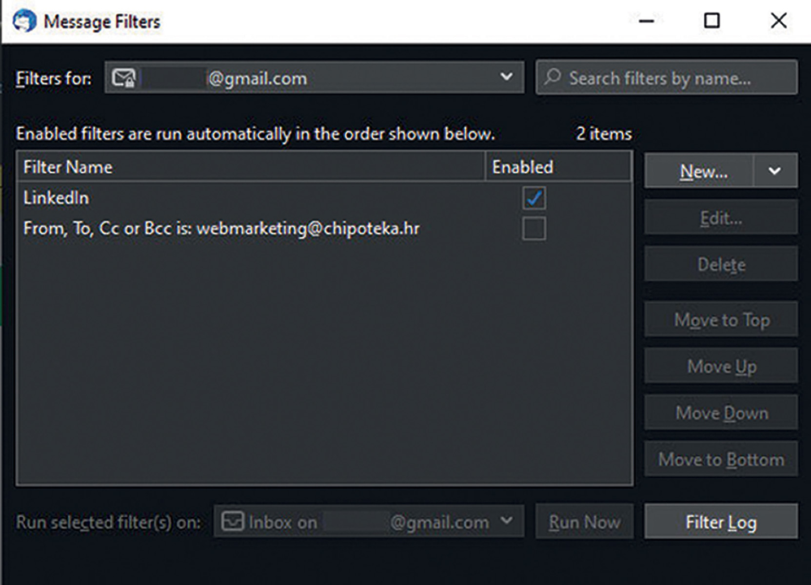 Moguće je postaviti nekoliko uvjeta tako da kliknete na ikonicu „+“ te dodate i „subject“ kakav želite. Najčešće korišteni filter je onaj koji sadrži domenu s koje je došao mail. Tako da npr. možete odabrati sve mailove koje vam je poslao Facebook servis uz uvjete „From“ „contains“ „@facebook.com“ te ih pospremiti u mapu „Facebook“.