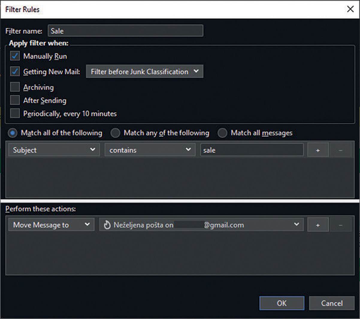 Kliknite na „New“. Filteru dodajte neko ime, npr. „Sale“. Niže pod Subject contains dodajte riječ „sale“. Odredite što se događa s porukama koje u Subjectu sadrže tu riječ. Mi smo odabrali da se poruka premjesti u neželjenu poštu. Kliknite na OK.