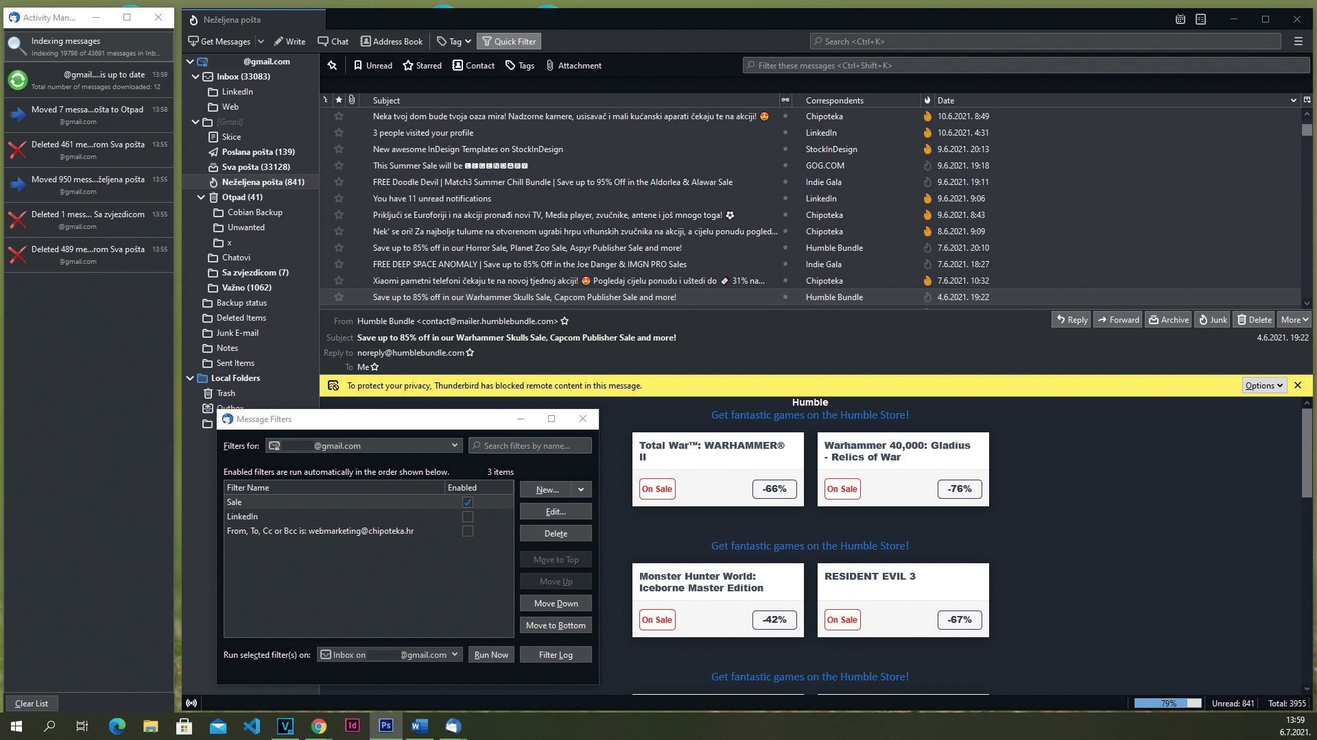 Najjednostavniji način čišćenja je putem neke od mail aplikacija kao što je Microsoft Outlook, no kako on nije besplatan ne tražite dalje od Thunderbirda. Za razliku od drugih email aplikacija koje se reklamiraju kao besplatne, Thunderbird se pokazao vrlo korisnim jer ne nameće reklame te nema ograničenja u korištenju koja smo zatekli kod nekih besplatnih mail aplikacija. Prva stvar koju bi trebali napraviti prije no što krenete s brisanjem tj. čišćenjem mailova, je backup vaših mailova i drugih stvari s vašeg Google accounta. Zlatno pravilo glasi - backup, backup, backup!