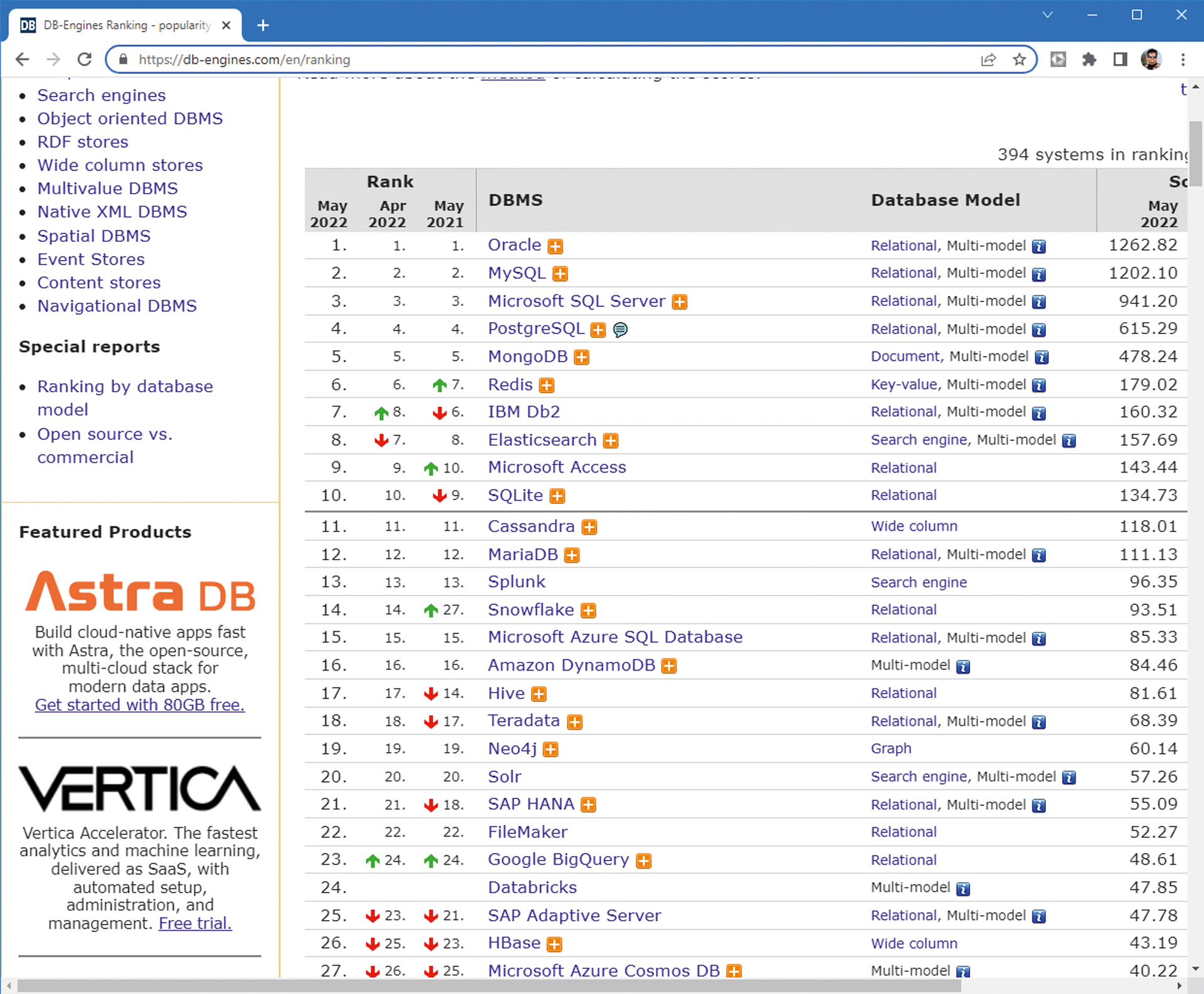 Pregled najpopularnijih baza podataka (i njihovih tipova).