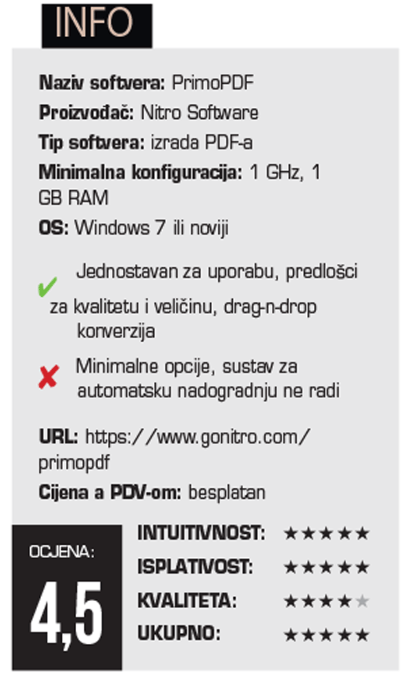 PDF je danas najuobičajeniji format za razmjenu dokumenata. Lagan je, pregledan i bez obzira u kojem ga programu otvarate, gotovo sa stopostotnom sigurnošću možete biti sigurni da će ostati nepromijenjen. Iako danas većina komercijalnih aplikacija podržava izvoz dokumenata u PDF, možemo pronaći još brojne primjene za PDF konvertere. PrimoPDF je pouzdan alat s dugogodišnjim stažem, no nije potrebno previše mijenjati ono što odlično funkcionira, zar ne? Jedna od glavnih prednosti alata je njegova jednostavnost upotrebe. Nakon instalacije, PrimoPDF se integrira u vaš sustav kao virtualni pisač. To znači da možete pretvoriti bilo koji dokument ili datoteku u PDF format tako što ćete odabrati PrimoPDF kao pisač i jednostavno kliknuti “Print”. Nakon toga, od vas će biti zatraženo da odaberete odredište na kojem želite spremiti novi PDF dokument. Sve je gotovo u samo nekoliko koraka, a korisničko sučelje je vrlo intuitivno, što olakšava i neiskusnim korisnicima da ga koriste bez ikakvih problema. Osim toga, alat će na radnu površinu smjestiti drag-n-drop prečicu u koju se dokument može povući, a skripta će odraditi sav posao – ne spremiti povučeni dokument na radnu površinu.