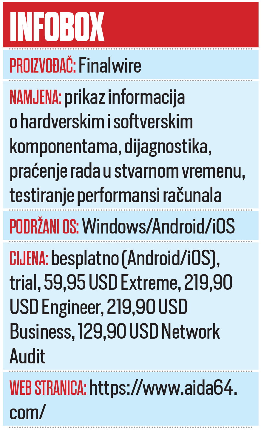 Među esencijalne softverske alate koje svaki hardverski entuzijast jednostavno mora imati svakako spada i AIDA64. Riječ je o aplikaciji koja na jednom mjestu pruža vrlo detaljne informacije o hardverskim i softverskim komponentama svakog računala, omogućuje praćenje u realnom vremenu rada pojedinih hardverskih komponenti, dijagnostiku, testiranje stabilnosti i performansi, praćenje rada računala na daljinu, kao i kreiranje detaljnih izvještaja i statistike online i offline.