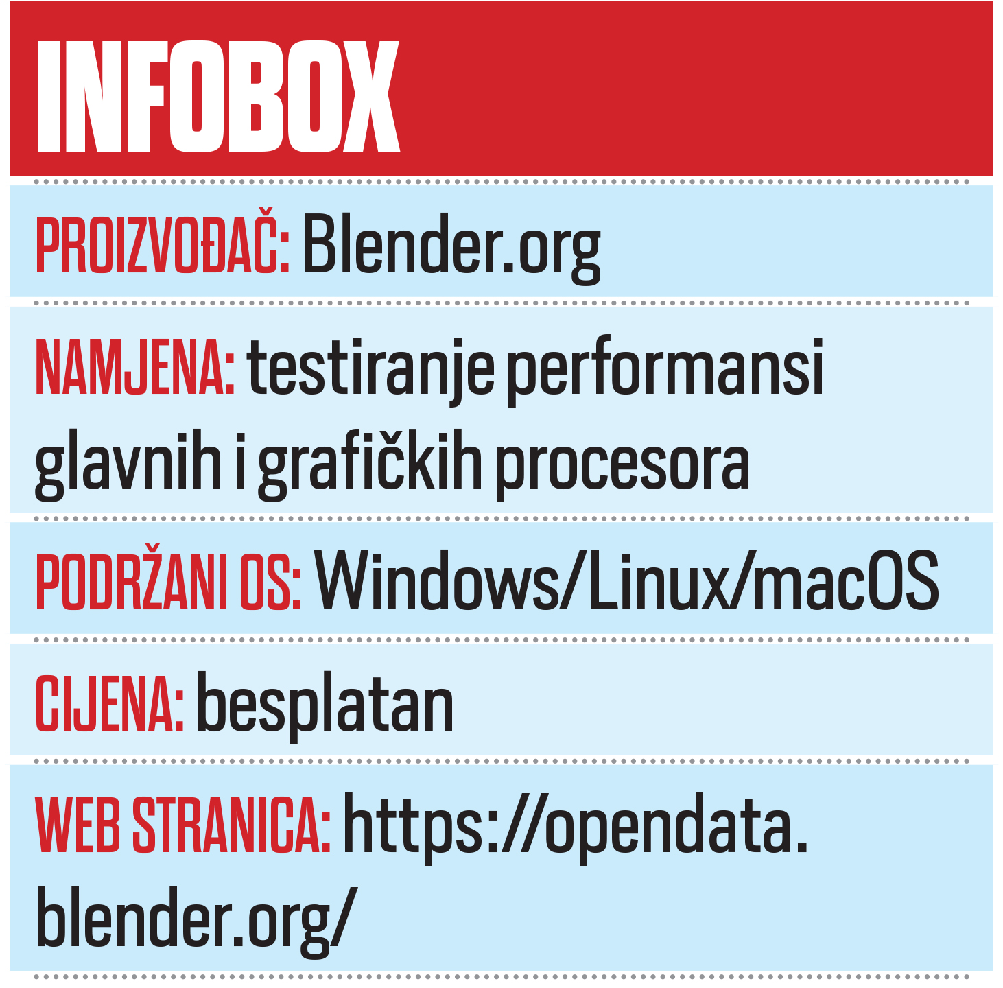 Blender Open Data benchmark osmišljen je kao alat za testiranje performansi u Blenderu kada su u pitanju glavni i grafički procesori. Dostupan je u verzijama za Windowse, Linux i macOS, a možete ga pokrenuti u online i offline načinu korištenja. Ono što je velika prednost ovog testa je poprilična baza online rezultata koju možete koristiti za usporedbu s drugim uređajima.