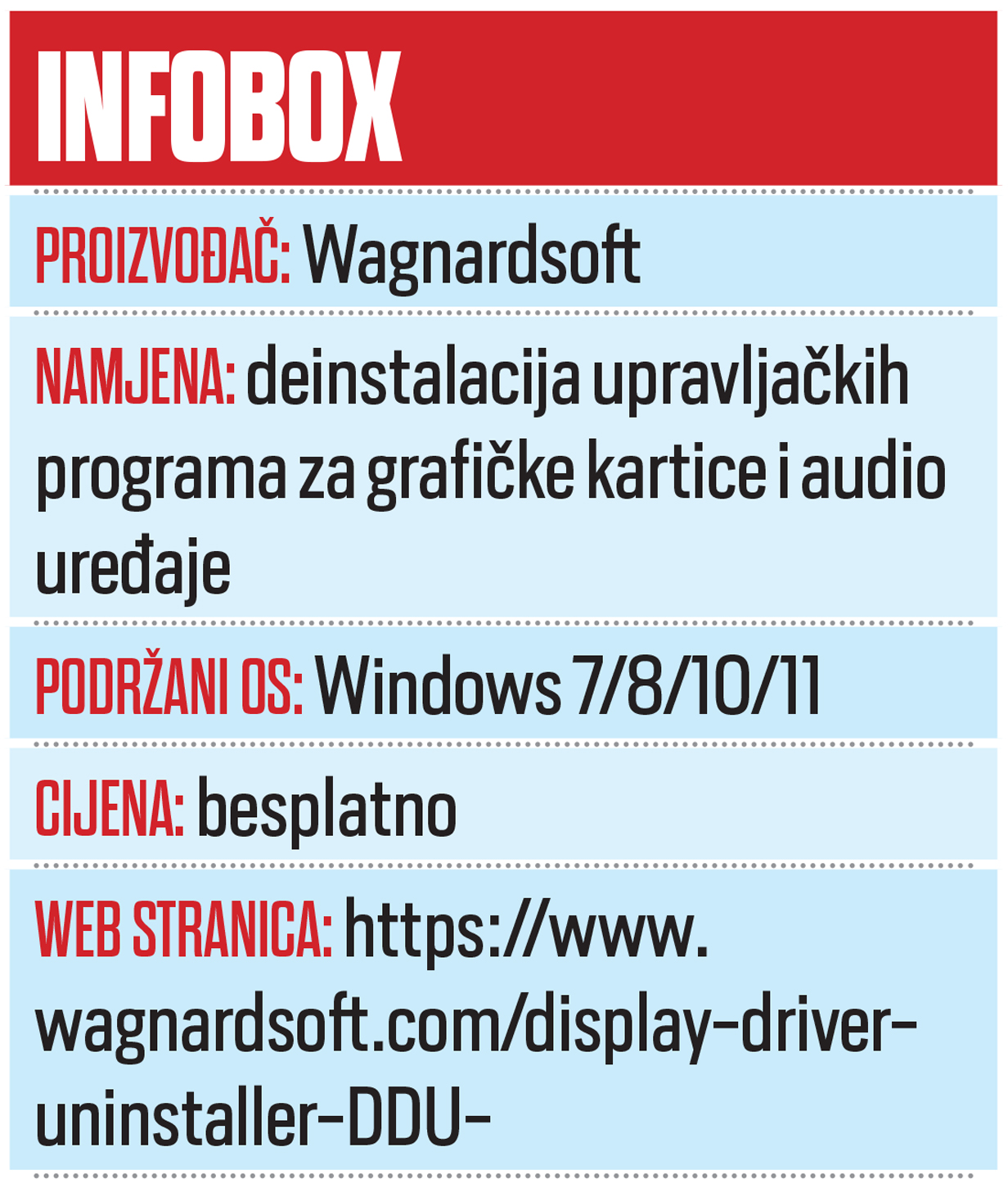 U tom slučaju, spas je u vrlo korisnom alatu pod nazivom Display Driver Uninstaller ili skraćeno DDU. DDU, istina, može deinstalirati i upravljačke programe za audio uređaje, no najčešće ga koristimo prilikom problema s upravljačkim programima za grafičke kartice. Na ovaj način je moguće posve otkloniti sve zaostatke starih upravljačkih programa koji znaju stvarati probleme.