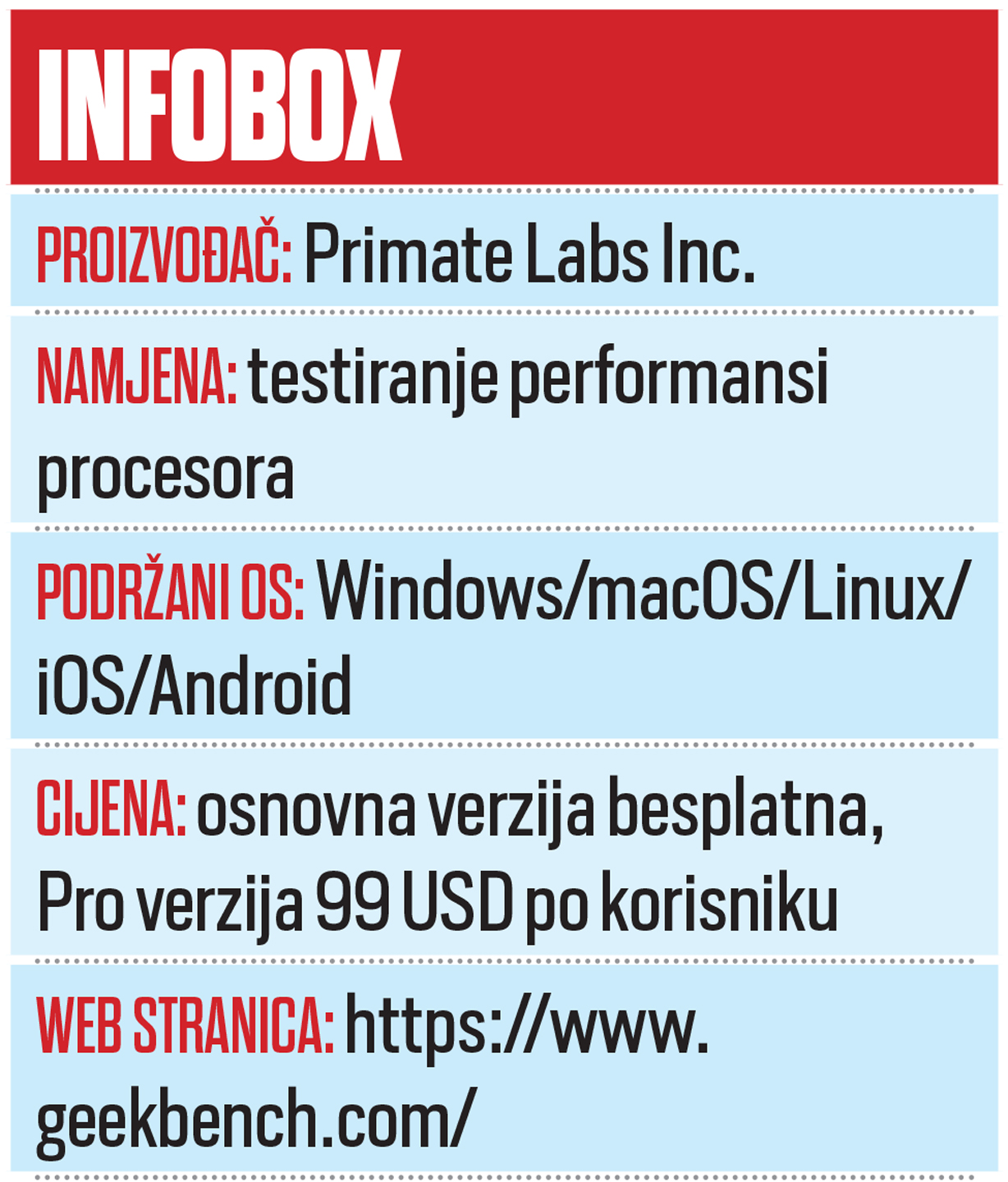 Geekbench je najpoznatiji multiplatformski test brzine procesora kojeg je razvila tvrtka Primate Labs Inc. U samom početku je Geekbench podržavao isključivo MacOS i Windowse, međutim, danas podržava i sve druge platforme i operacijske sustave. Upravo u toj činjenici leži najveća prednost ovog alata, s obzirom da nam omogućuje testiranje i direktnu usporedbu performansi procesora na različitim uređajima (desktop, laptop, pametni telefoni, tableti) prilikom korištenja različitih operacijskih sustava.