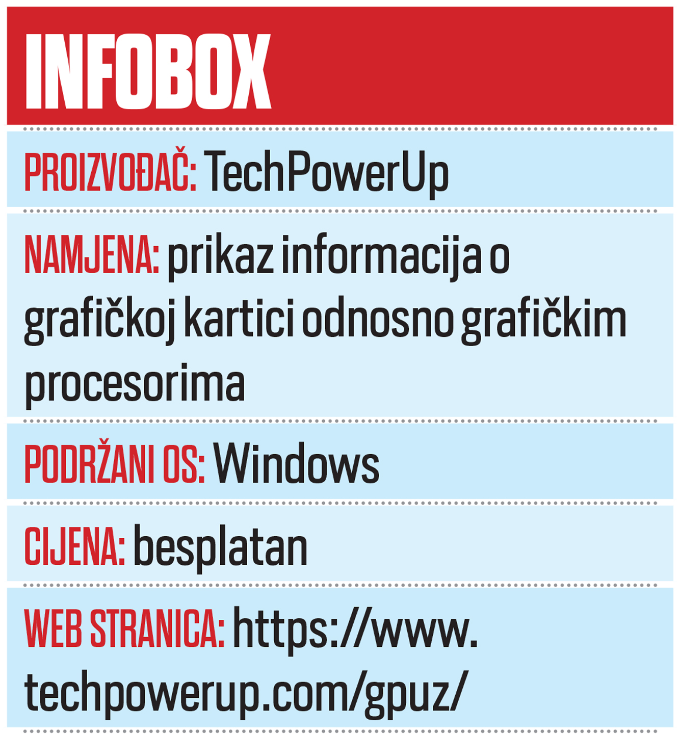 Ono što je CPU-Z za procesore, to je GPU-Z za grafičke kartice. GPU-Z je nezaobilazan alat svakog hardverskog geeka koji vam omogućuje da saznate detaljne informacije o grafičkoj kartici, odnosno svim dostupnim grafičkim procesorima računala. Ovaj iznimno koristan alat za sve ljubitelje tehnologije i najnovijih grafičkih kartica već godinama održava i unaprjeđuje ekipa poznate hardverske web stranice TechPowerUp na čelu s W1zzardom.