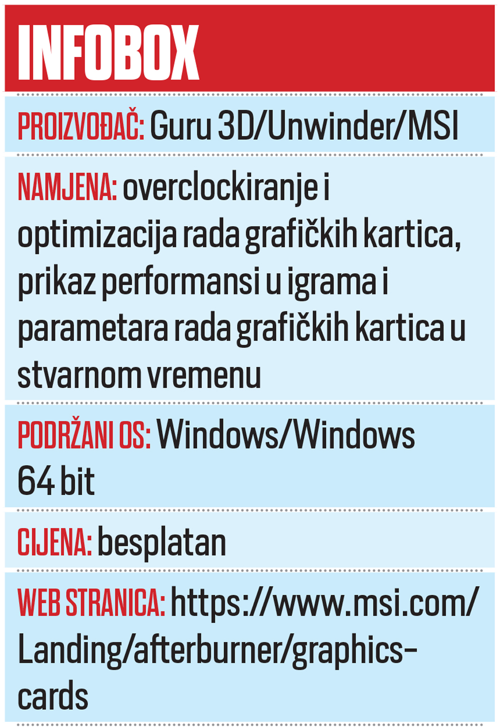 Najčešće korišteni i najpopularniji alat za overclockiranje i optimizaciju rada grafičkih kartica. Mnogi ga znaju pod imenom Rivatuner, a razvijen je od strane ruskog programera i hardverskog entuzijasta Alekseja Nicolaychuka (poznatijeg kao Unwinder), primarno kao alat za overclockiranje i praćenje rada Nvidijinih kartica. Danas, međutim, podržava i AMD-ove kartice. U posljednjih nekoliko godina, razvoj ovog alata sufinanciran je od strane MSI-ja, pa je stoga i naziv promijenjen u MSI Afterburner.