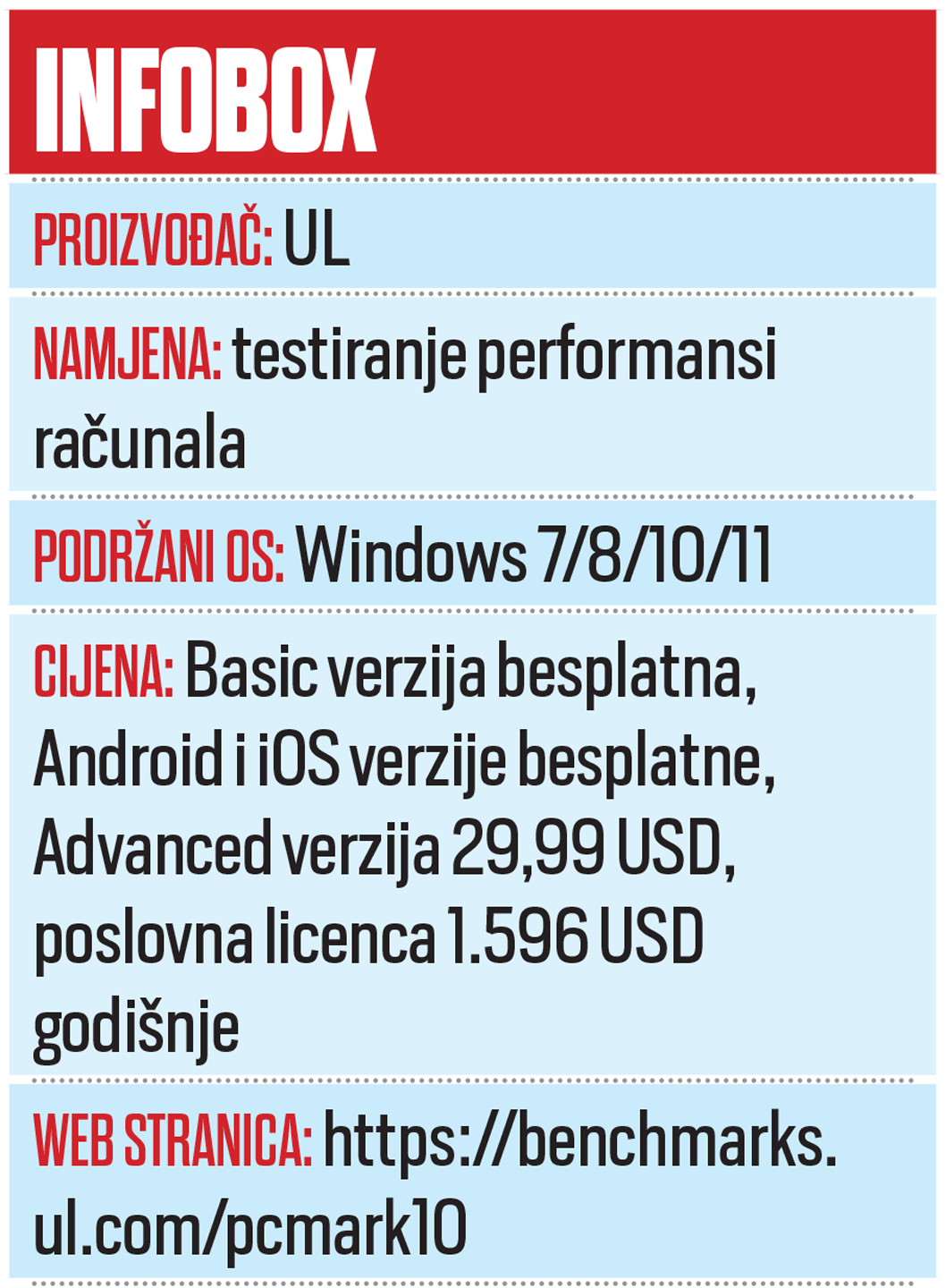 Svakako jedan od najpoznatijih općenitih testova performansi računala. U svojoj aktualnoj verziji, PCMark 10 je zapravo skup različitih testova koji vam omogućuju da brzo i jednostavno testirate performanse pojedinih računala ili nekih dijelova jednog računala. Novije verzije PCMarka se dobrim dijelom oslanjaju na testove u stvarnom okruženju, odnosno koriste upravo one aplikacije koje svi mi često koristimo u svakodnevnom radu s računalom. Valja napomenuti kako postoji i posebna verzija namijenjena testiranju performansi Android uređaja pod nazivom „PCMark for Android“ koja se razlikuje od PCMarka 10.