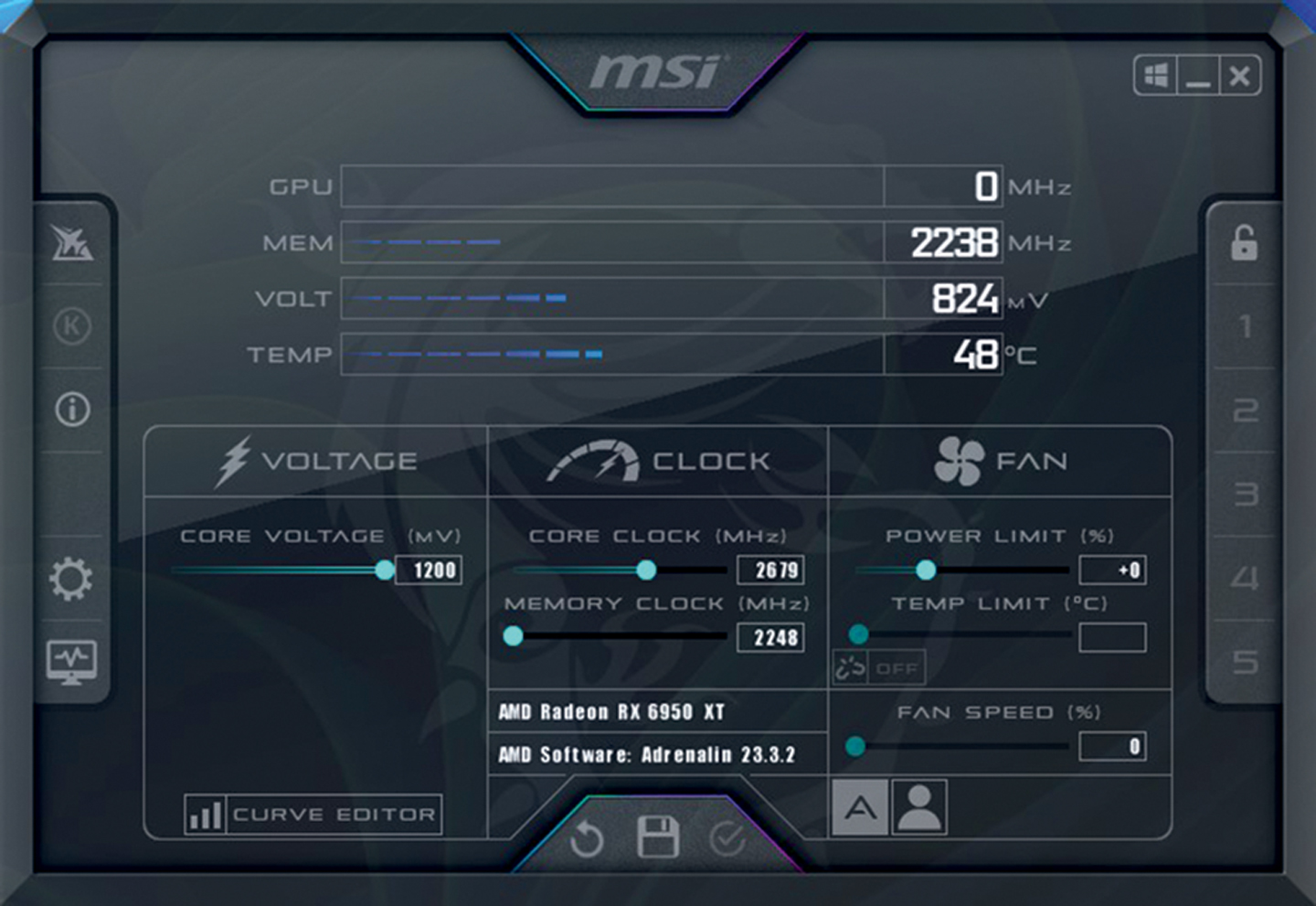 Vrlo korisna je i funkcija koja dopušta detaljno podešavanje krivulje brzine ventilatora i spremanje odgovarajućih profila. Na ovaj način možete prilagoditi brzinu vrtnje ventilatora, ovisno o tome želite li niže temperature ili tiši rad.