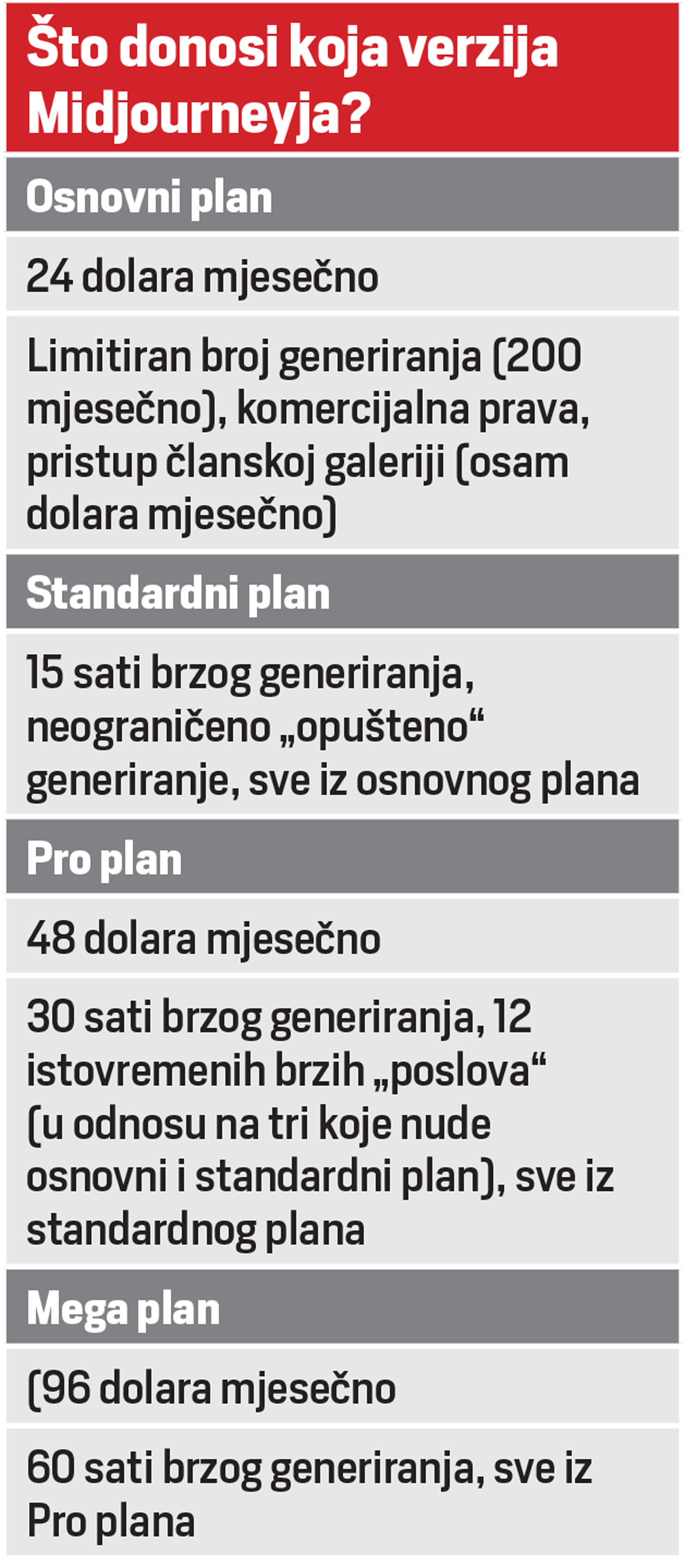 Na pitanje kako će ti AI alati utjecati na svakodnevni život dizajnera, Mubrin nam je rekao da je „budućnost dizajna sigurno u simbiozi s AI tehnologijama“ koje će redefinirati ulogu dizajnera u procesu stvaranja, zbog čega će dizajneri „više vremena moći posvećivati stvarnim problemima i kako da dizajn[erska] rješenja budu više korisna za ljude“. Midjourney je, kao i većina komercijalnih generatora slika, alat koji morate platiti.