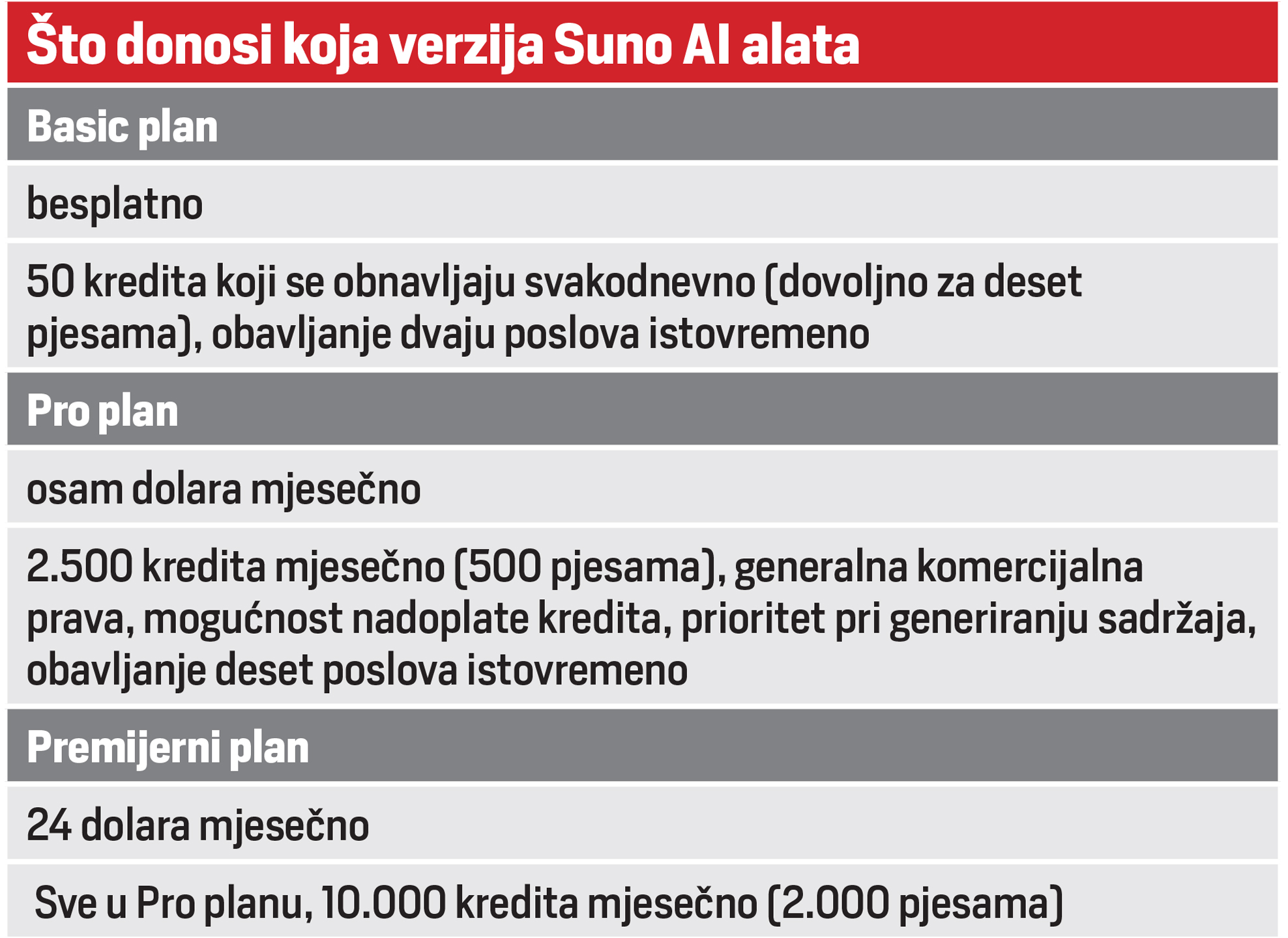 Ali zato možemo zamisliti kako bismo ih mogli integrirati u naš svakodnevni rad kako bismo smanjili obujam posla, otvorili prostor za razvoj novih ideja ili se jednostavno zabavljali stvarajući zabavnu glazbu sa stihovima po našoj želji bez imalo glazbene ekspertize. Stoga vam ne preostaje ništa drugo nego isprobati naše esencijalne AI alate i pronaći one koji će olakšati i unaprijediti vaš život.