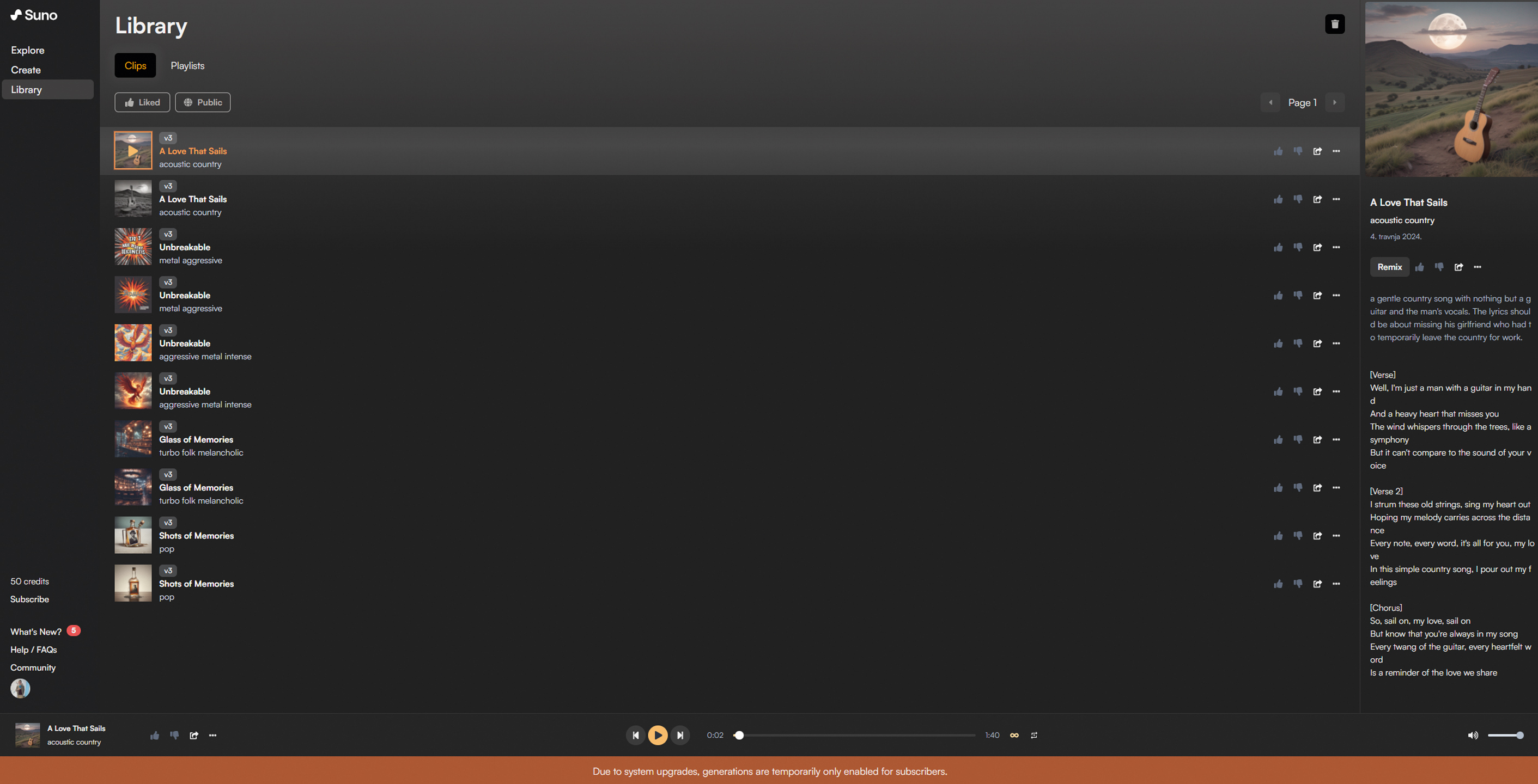 Tako smo dobili hitove poput A Love That Sails – akustične country numere o dečku kojem nedostaje njegova djevojka jer je privremeno morala napustiti njihovu državu; Unbreakable – agresivnu metal pjesmu za intenzivne treninge u teretani i Shots of Memories – moderni pop hit o ranije spomenutom gospodinu kojeg se ne bi posramio nijedan Top 40 radio na domaćim, ali i inozemnim tržištima (AI nas nije dobro poslušao s prvim promptom, pa smo dobili ovu pjesmu prije nego što je ponovnim kucanjem prompta shvatio da želimo malo balkanskog melosa u našem hitu.