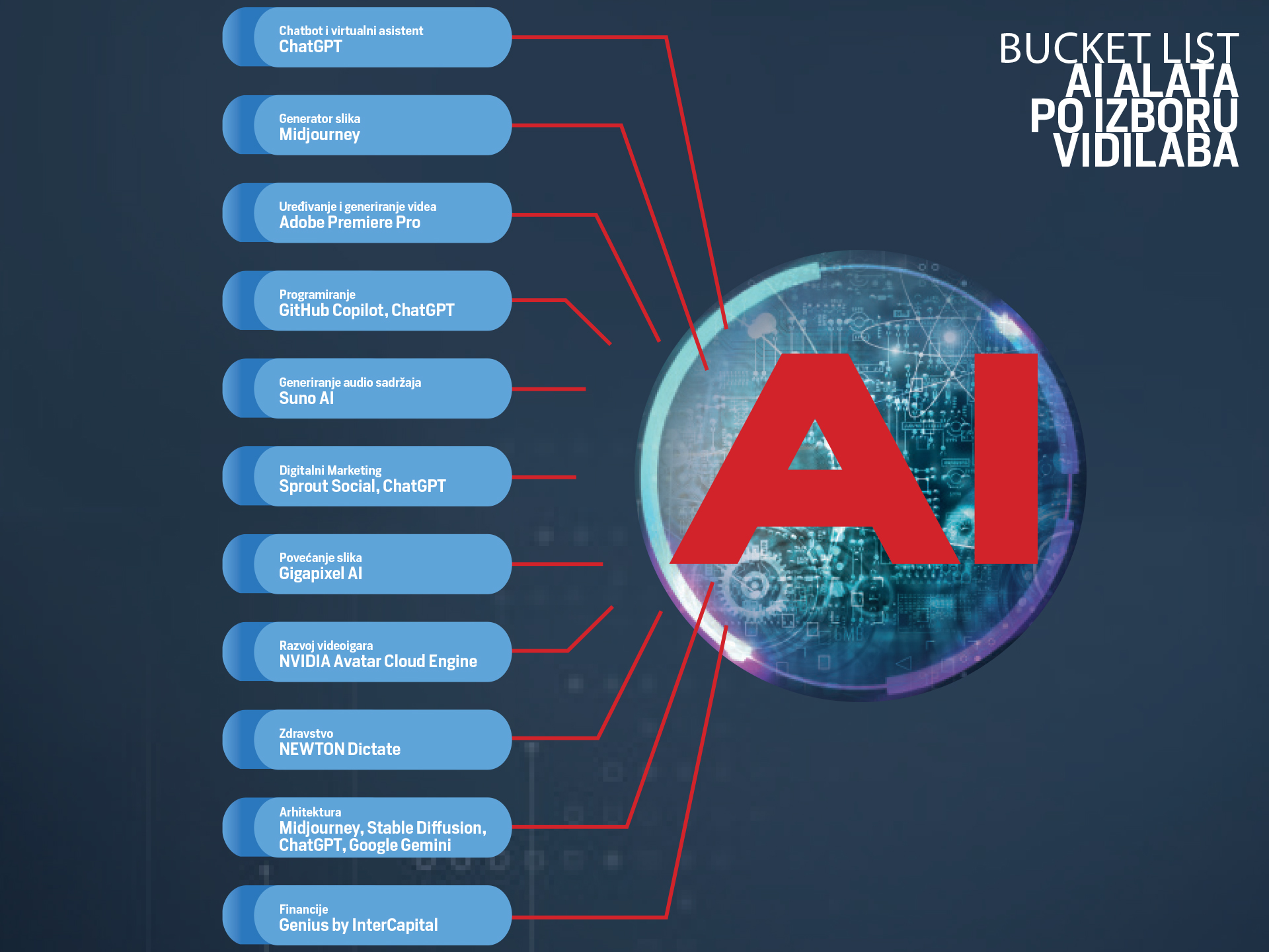 Iz dana u dan svjedočimo izlasku novih alata i postaje sve teže i teže pratiti zašto bi jedan trebao biti bolji od drugog. VIDILAB se stoga odlučio istražiti prednosti i mane raznih AI alata i donijeti vam preporuke u jedanaest kategorija, kao i atraktivne alternative, koje vam predlažu domaći stručnjaci na svojim područjima u kojima ih koriste kao profesionalci. Ukupno 27 AI alata koje već danas trebate početi njuškati i obilato ih koristiti.