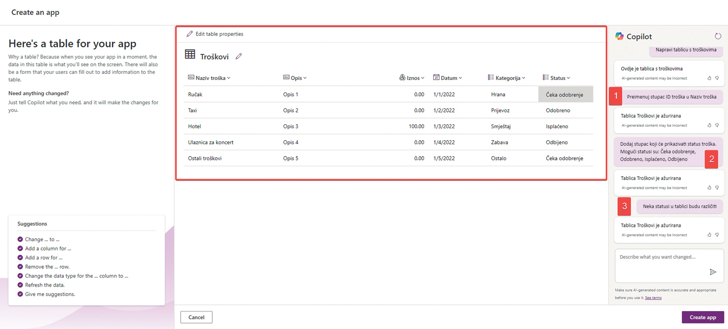 Naš zadatak je izraditi LCNC aplikaciju koja prikazuje izvještaj troškova u organizaciji uz pomoć AI-ja. Krenimo redom! U polje na slici 1 pod brojem 4 upisujemo „Trebam aplikaciju koja prati troškove!“. Kako bismo pokrenuli proces izrade aplikacije, stisnemo na strelicu desno od broja 4, pričekamo koji trenutak, pa nam se prikaže prijedlog tablice s podacima koje ćemo unositi, a to vidimo na slici 3 unutar crvenog pravokutnika. Inicijalni prijedlog tablice nam nije odgovarao, pa smo tražili pomoć AI-ja. AI nam je kroz chat preimenovao prvi stupac (broj 1 na slici 2), dodao novi stupac sa statusom u kojem se trošak nalazi (broj 2) te popunio statuse (broj 3) kako ne bismo morali ručno. Kada smo zadovoljni s podacima, u donjem desnom kutu na slici 2 kliknemo Create app.