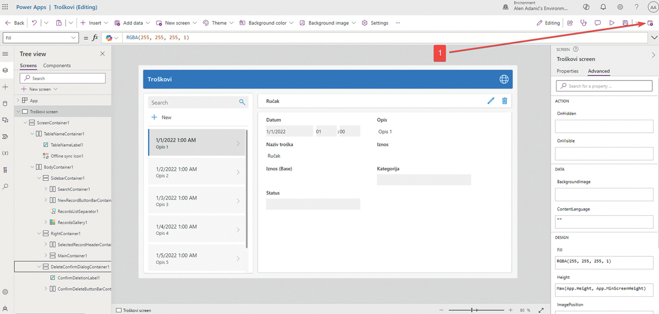 3. Pričekamo par trenutaka, pa će nam se prikazati sučelje kao na slici 3 gdje možemo vidjeti kako će aplikacija izgledati u produkcijskom radu. Na sučelju postoji mogućnost uređivanja, dodavanja i uklanjanja različitih polja za unos, kao i izgleda i povezivanja s drugim izvorima podataka. Ako smo zadovoljni s izgledom i svim ostalim postavkama aplikacije, možemo je isporučiti u produkcijski rad, a to radimo pritiskom na gumb koji pokazuje broj 1 na slici 3.