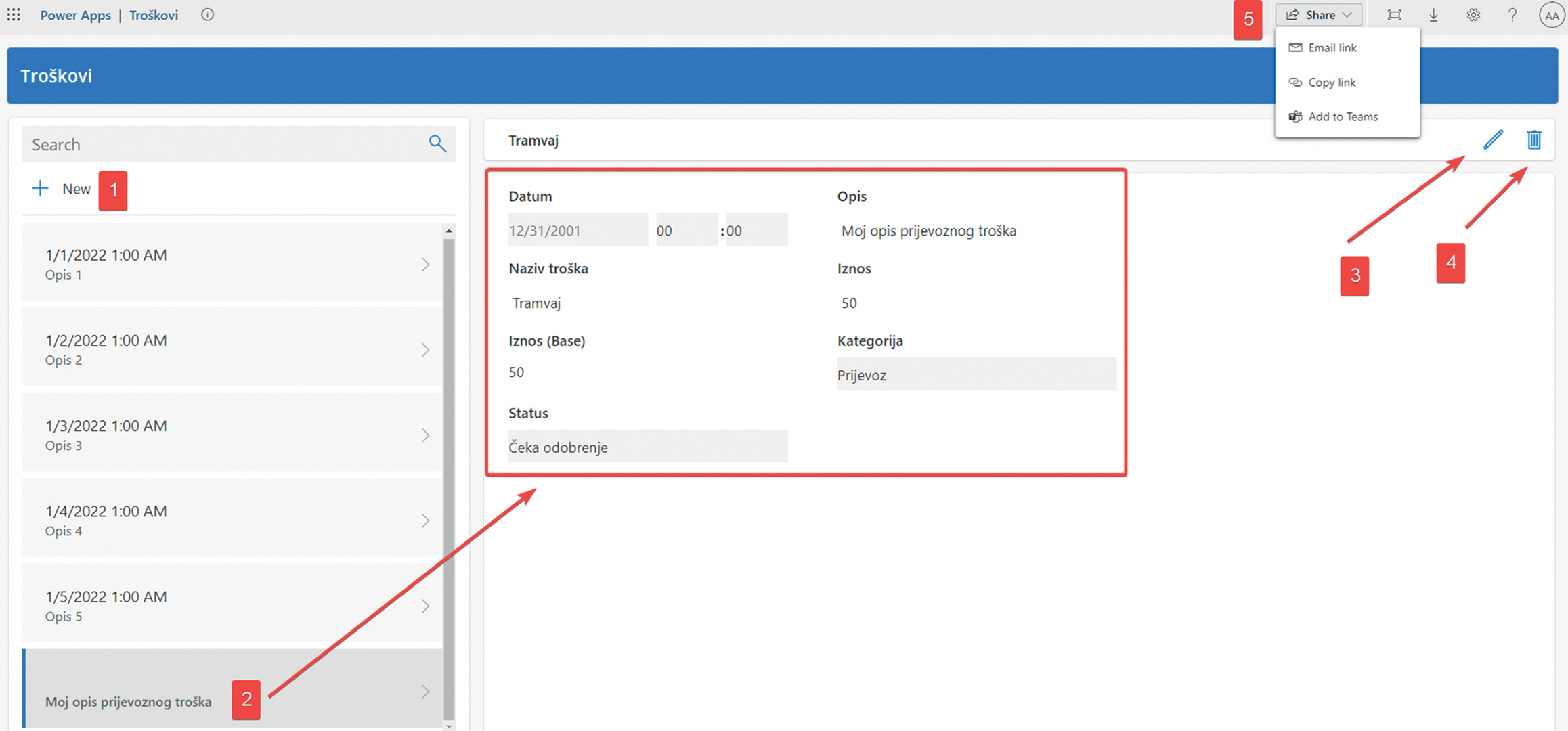 4. Bravo! Naša aplikacija je u produkcijskom radu i možete je vidjeti na slici 4. Zabavno i lagano, zar ne? Odmah su omogućeni unosi novih troškova što vidimo na broju 1. Na broju 2 vidimo odabir i prikaz detalja troška, pod brojem 3 uređivanje trenutno odabranog troška, a pod brojem 4 vidimo gumb za brisanje troška.