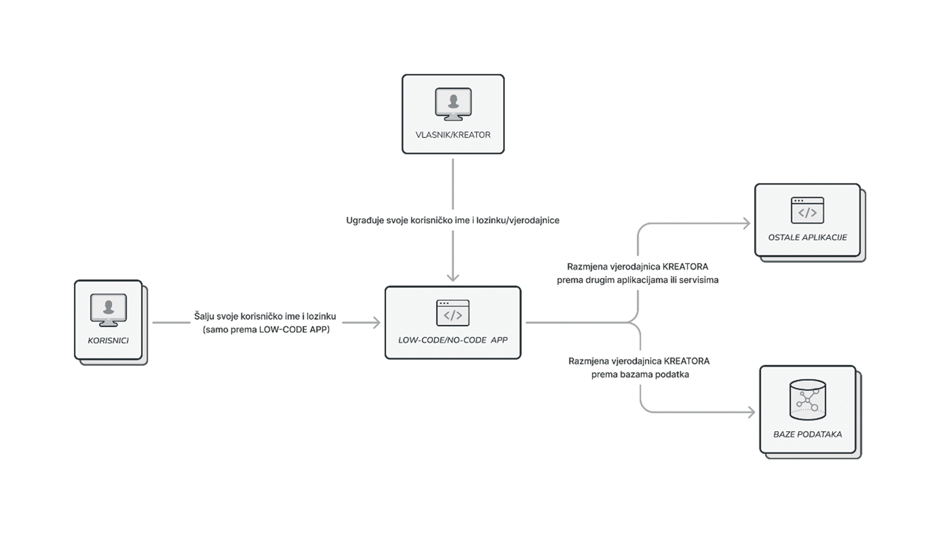 5 možemo vidjeti kako u LCNC aplikacijama poslovna osoba ugrađuje svoje korisničko ime i lozinku. Sve je u redu dok ta ista osoba i koristi tu aplikaciju, a problem nastaje kada tu aplikaciju poželi podijeliti s drugim kolegama. Izvana će sve izgledati dobro, aplikacija će tražiti korisničko ime i lozinku kolege kojem ste dali aplikaciju na korištenje, kolega će se uspješno prijaviti, no u pozadini će se koristiti vjerodajnice kreatora.