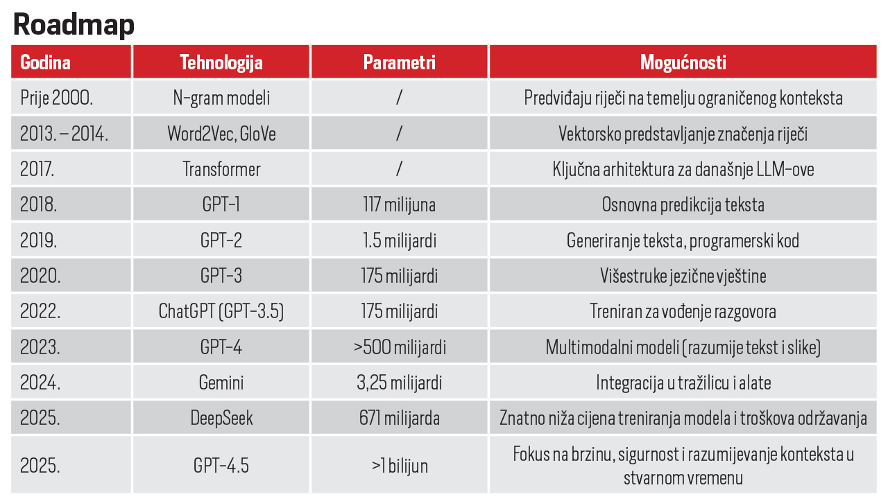 Veliki jezični modeli (LLM – Large Language Models) predstavljaju jednu od najvažnijih prekretnica u razvoju umjetne inteligencije. Suvremeni sustavi umjetne inteligencije sve se više oslanjaju na modele koji nisu strogo utemeljeni na pravilima, već na podacima i obrascima naučenima iz ogromnih skupova podataka. Danas su veliki jezični modeli sposobni analizirati, razumjeti i stvarati jezični sadržaj gotovo na razini ljudske interakcije, čime uvelike proširuju mogućnosti tehnologije u svakodnevnom i profesionalnom okruženju, te imaju sve širu primjenu u obrazovanju, industriji, zdravstvu, tehnologiji, ali i svakodnevnom korištenju za osobne potrebe. LLM-ovi koriste ogromne količine teksta iz knjiga, članaka, web stranica i drugih izvora da bi naučili obrasce u jeziku – kako se riječi povezuju i kako ljudi prirodno komuniciraju. Razvoj jezičnih modela seže gotovo četrdeset godina u prošlost kad su se koristili statistički modeli jezika, poput n-gram modela, koji su predviđali sljedeću riječ na temelju nekoliko prethodnih, no oni su bili ograničeni jer nisu mogli razumjeti duži kontekst. Prvi veći iskorak u razvoju jezičnih modela smo imali u dvijetisućitim razvojem obrade prirodnog jezika (NLP), kad su se pojavili složeniji modeli poput TF-IDF i vektorskog predstavljanja značenja riječi Word2Vec i GloVe, koji su omogućili bolje razumijevanje odnosa među riječima, no još uvijek ne i cijelog konteksta. Prekretnica se dogodila 2017. kada je Google predstavio Transformer arhitekturu u radu “Attention is All You Need”. Ta arhitektura je temelj za sve moderne LLM-ove. Nakon Transformera, počinje rapidan rast i razvoj LLM-ova i ulazimo u modernu eru umjetne inteligencija koja i dalje nezaustavljivo raste. OpenAI 2018. godine predstavlja GPT-1, prvi veliki jezični model sa 117 milijuna parametara i osnovnom predikcijom teksta. Godinu dana kasnije, izašla je nova generacija GPT-2 s 1,5 milijardom parametara, koji je mogao generirati tekstove i programski kod, te izazvao popriličnu pažnju javnosti zbog realističnog jezika koji je sve više nalikovao ljudskom.