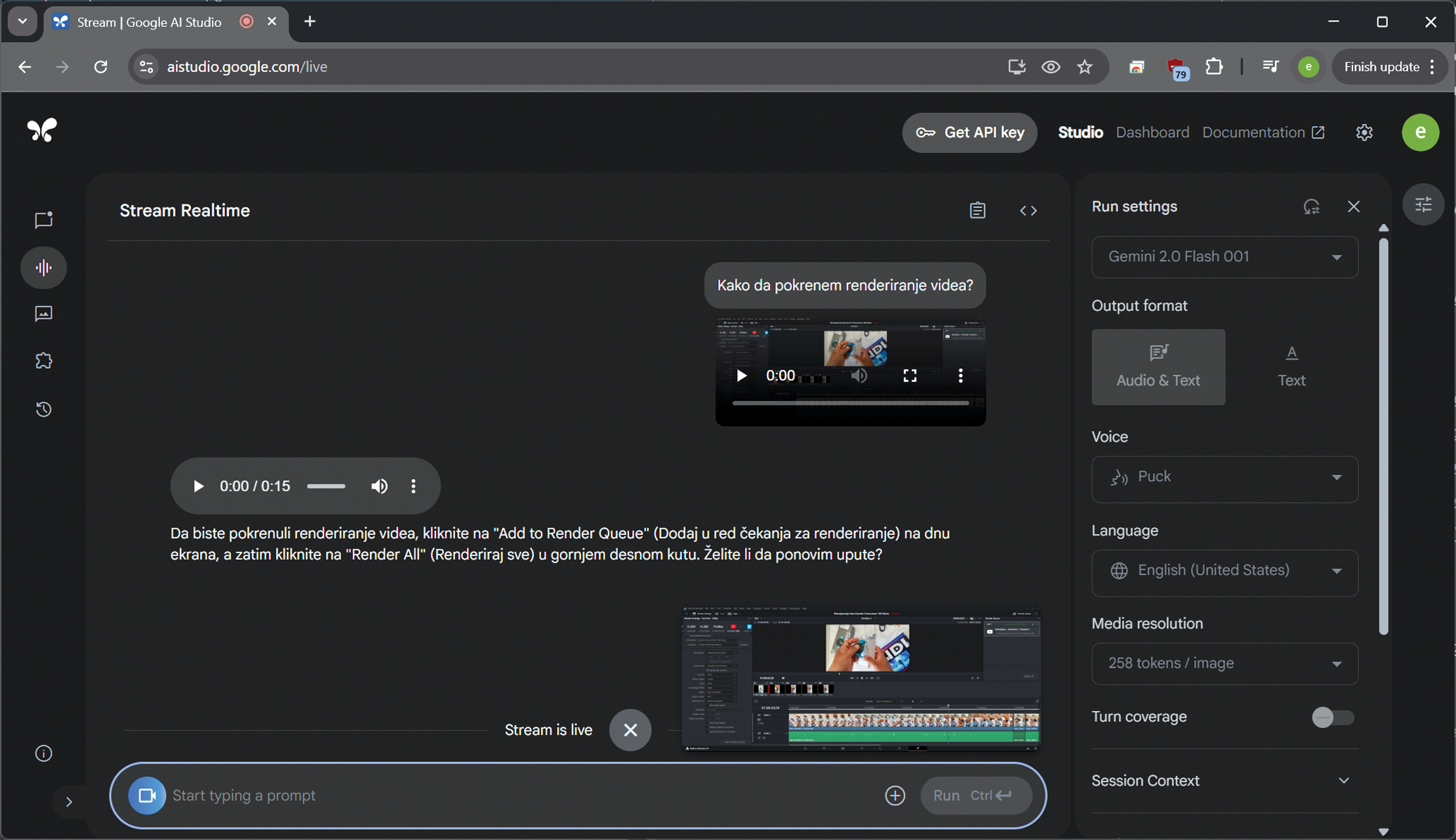 Primjer ovoga isprobajte tako da pokušate savladati korištenje neke aplikacije koju do sada niste nikada koristili. Recimo, instalirajte i pokrenite Blender za 3D modeliranje. Zatim pokrenite Googleov AI Studio s linka: https://aistudio.google.com/live. Kliknite na ikonicu Stream. Dobit ćete gumb „Share Screen“ kojim svoj trenutni ekran računala dijelite s multimodalnim LLM modelom Gemini. Sada ga možete upitati kako kreirati 3D objekt – za početak, možda da krenete od jednostavnijih oblika, pa nastavite s kompliciranijima. Svakako istu stvar možete isprobati s aplikacijom Excel ili nekom trećom. Sesija je ograničena na 10 minuta, a nakon toga možete krenuti s novom sesijom.