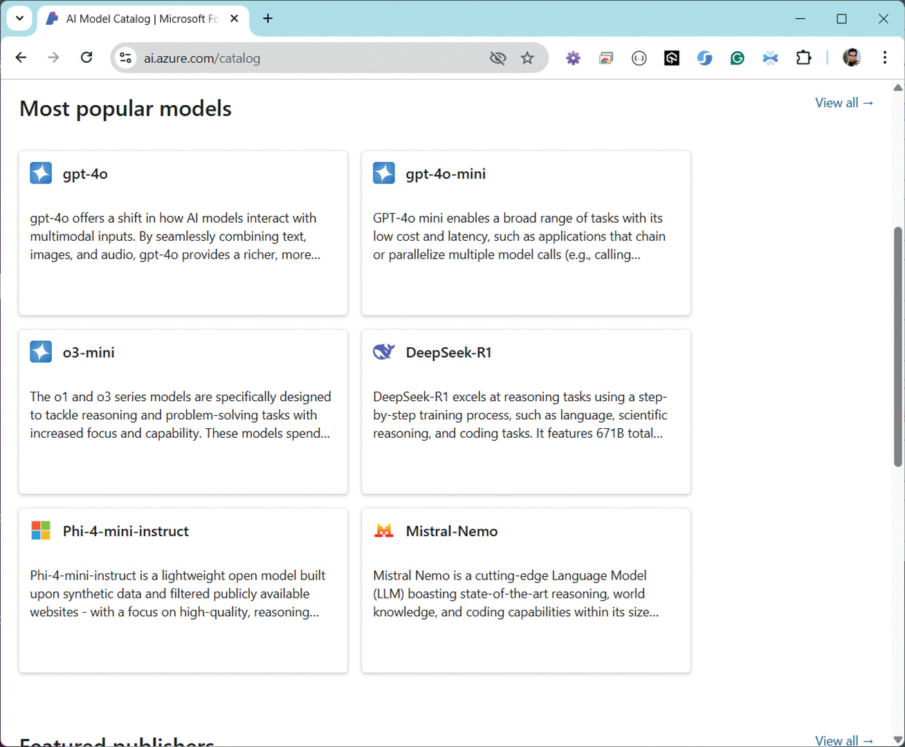 Pregled podržanih modela dostupan je na web adresi https://ai.azure.com/catalog. Kod početnog pregleda prvo se prikažu najpopularniji modeli, a po potrebi se može nastaviti s istraživanjem svih dostupnih modela. Nakon odabira jednog ili više modela potrebnih za izgradnju vašeg sustava, na raspolaganju je vrlo detaljna dokumentacija o svakom segmentu svakog pojedinog modela, što uključuje usporedbu s drugim sličnim modelima. Prije svega u brzini rada različitih modela.