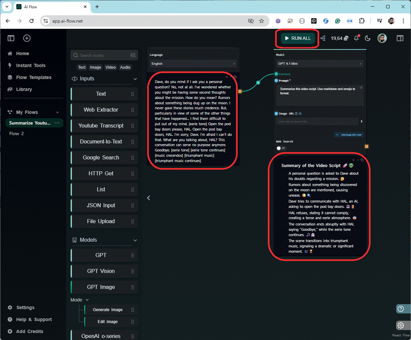 Drugi modul u nizu (na koji je povezan ovaj početni modul) naziva se GPT, a on predstavlja podršku za odgovarajući LLM model. U podrazumijevanim postavkama na ovom mjestu je postavljen GPT 4.1 Mini zato što su resursi ovog modela sasvim dovoljni za ono što se obrađuje kao ulazni podatak s YouTube Transcript modula. Kao dodatne parametre drugog modula možemo još navesti URL slike koja će se uključiti u rezultate analize, kratki opis postupka te mogućnost uključivanja dodatnog web pretraživanja. Ostavimo za sada sve ovo bez promjene, pa jednostavno kliknimo na gumb RUN ALL koji se nalazi na vrhu stranice. Nakon nekoliko sekundi potrebnih za izvođenje modela dogodit će se „magija“ nastala u suradnji između spomenuta dva modula. Ako to niste isprobali sami, rezultat možete vidjeti na pratećoj slici uz tekst.